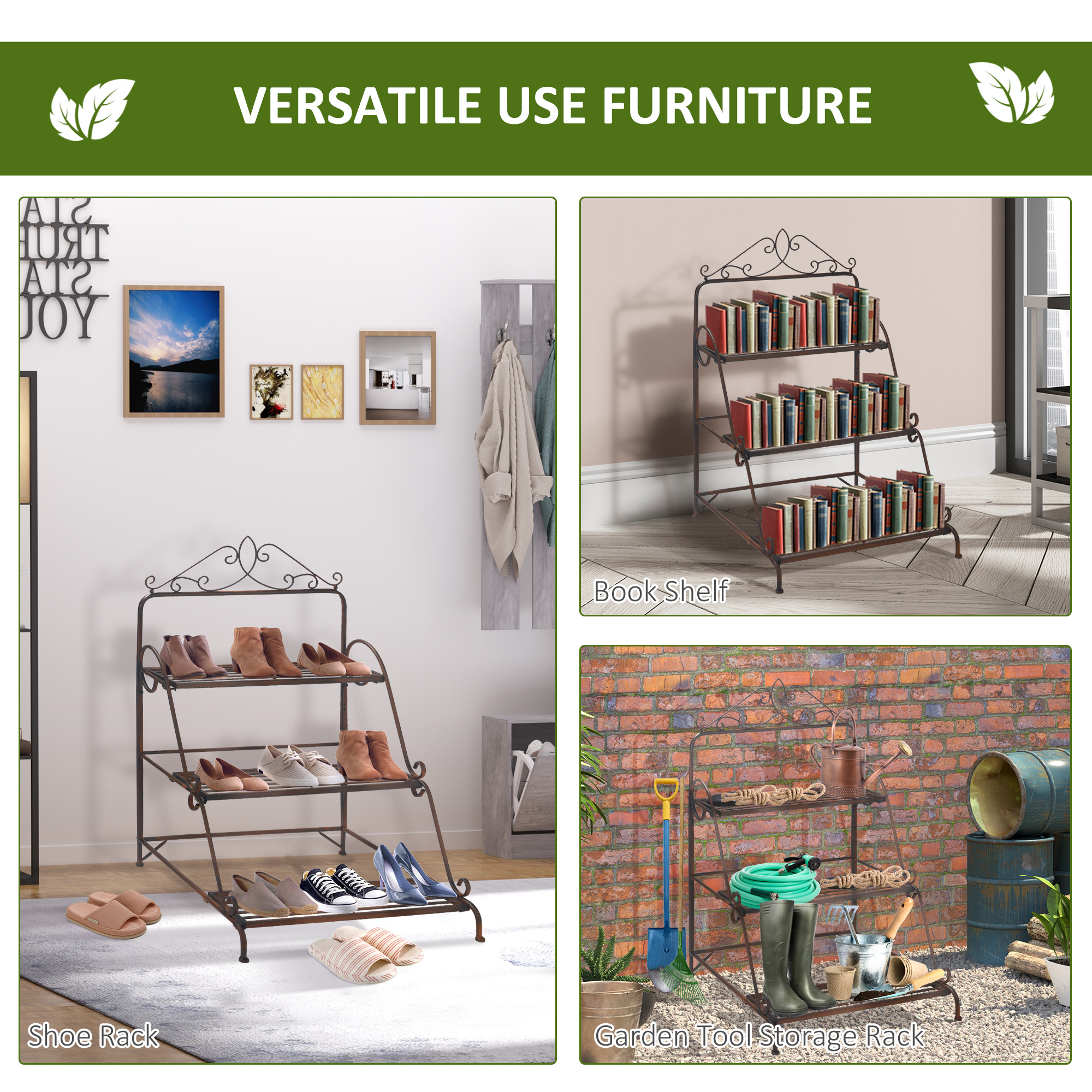 Add style and storage to your home with this tall plant stand from Outsunny. Our 3-tiered flower stand is built with a gorgeous sturdy metal scroll work frame, the plant shelf brings a touch of elegance to your porch, patio, indoor space, or wherever you want to utilize it. This tiered plant stand is perfect for holding everything from plants to books to decorative candles. With this corner plant stand, you can easily keep your surrounding area neat, tidy, and stylish!