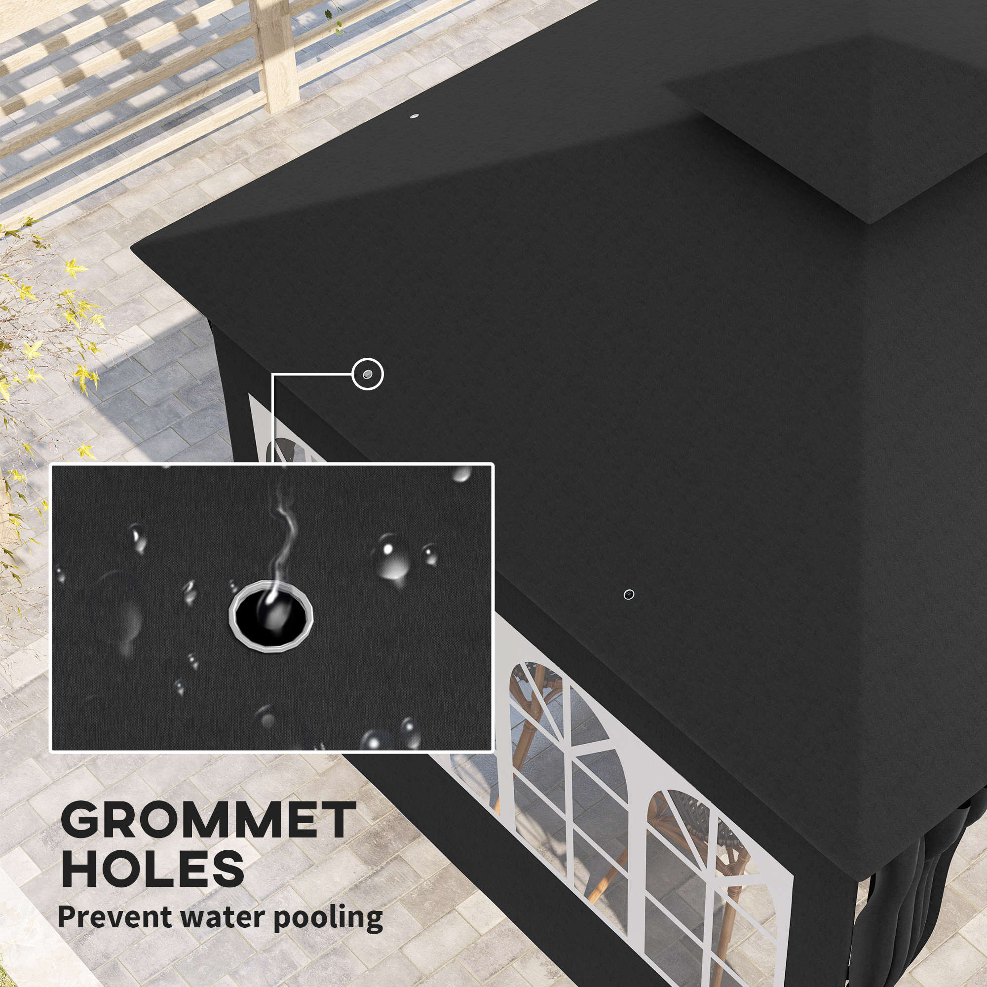 - Splash-resistant canopy, eight grommet holes prevent water pooling