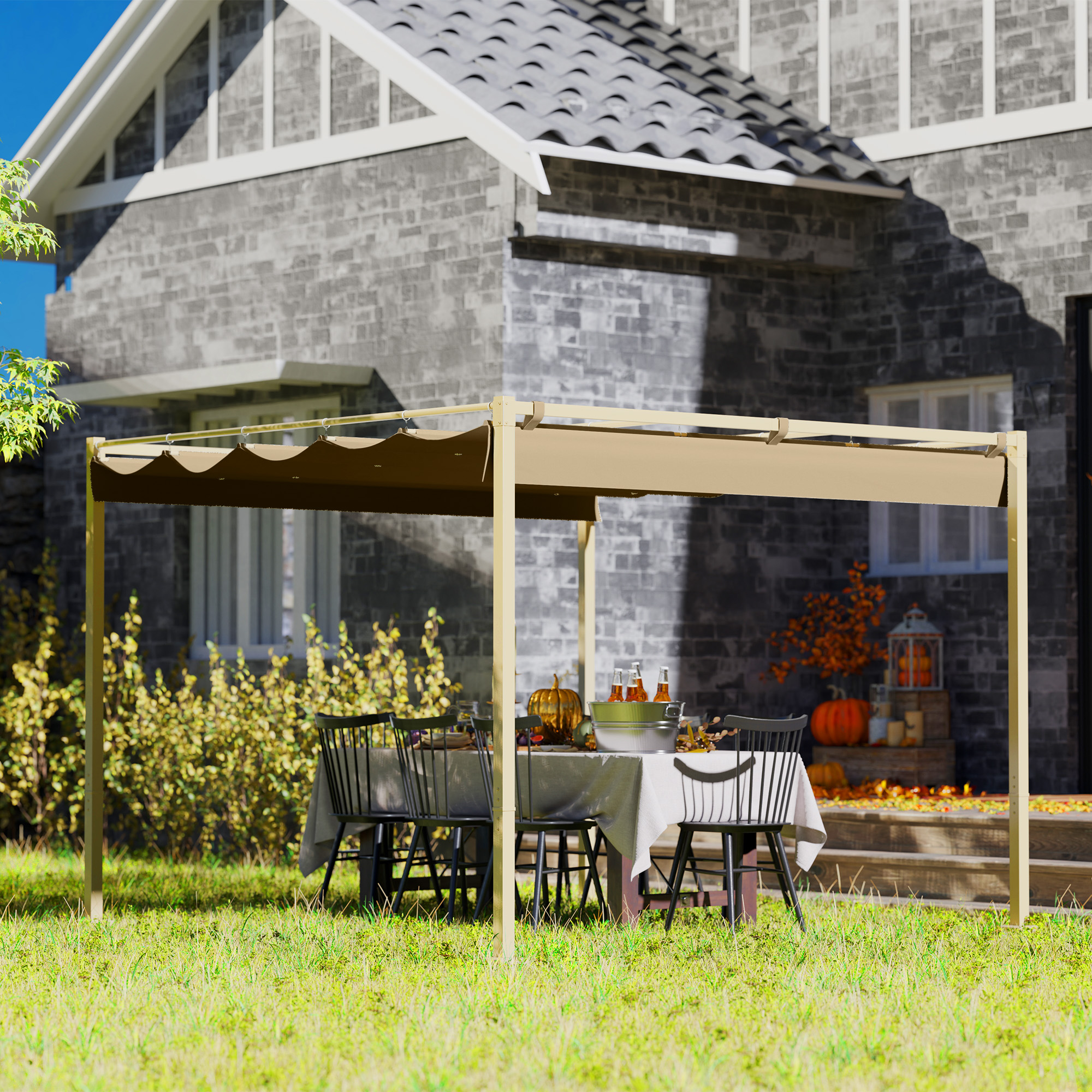 Create a shady and cool spot in the garden, anytime. Opt for this Outsunny 3 x 3 m pergola with roof. It's fitted with an adjustable canopy - slide it to a position you want, to let in as much or as little sunlight as you with; the hook fastenings keep it securely in place and allow smooth movement. It has a UV-resistant coating for safety in the sun. Fix it to either cement, grass or concrete surfaces, thanks to the included 8x ground stakes and 8x anchor bolts.