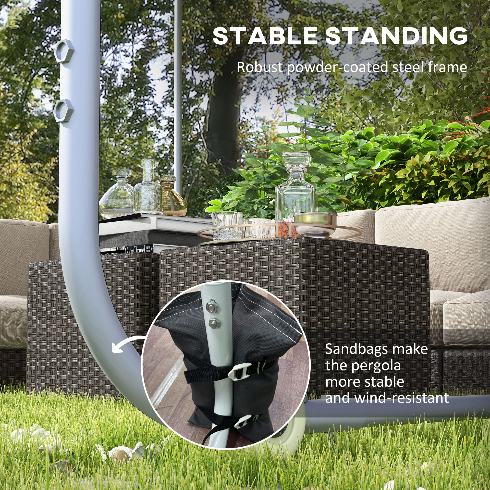 Sun shade, made mobile. This Outsunny garden pergola is fitted with wheels - move easily around your outdoor space to keep you protected in many places. A powder coated steel frame for a strong structure, fitted with a UV30+ protective canopy on top - keeps you safely shielded against sunlight as you relax. Four fillable sandbags included.