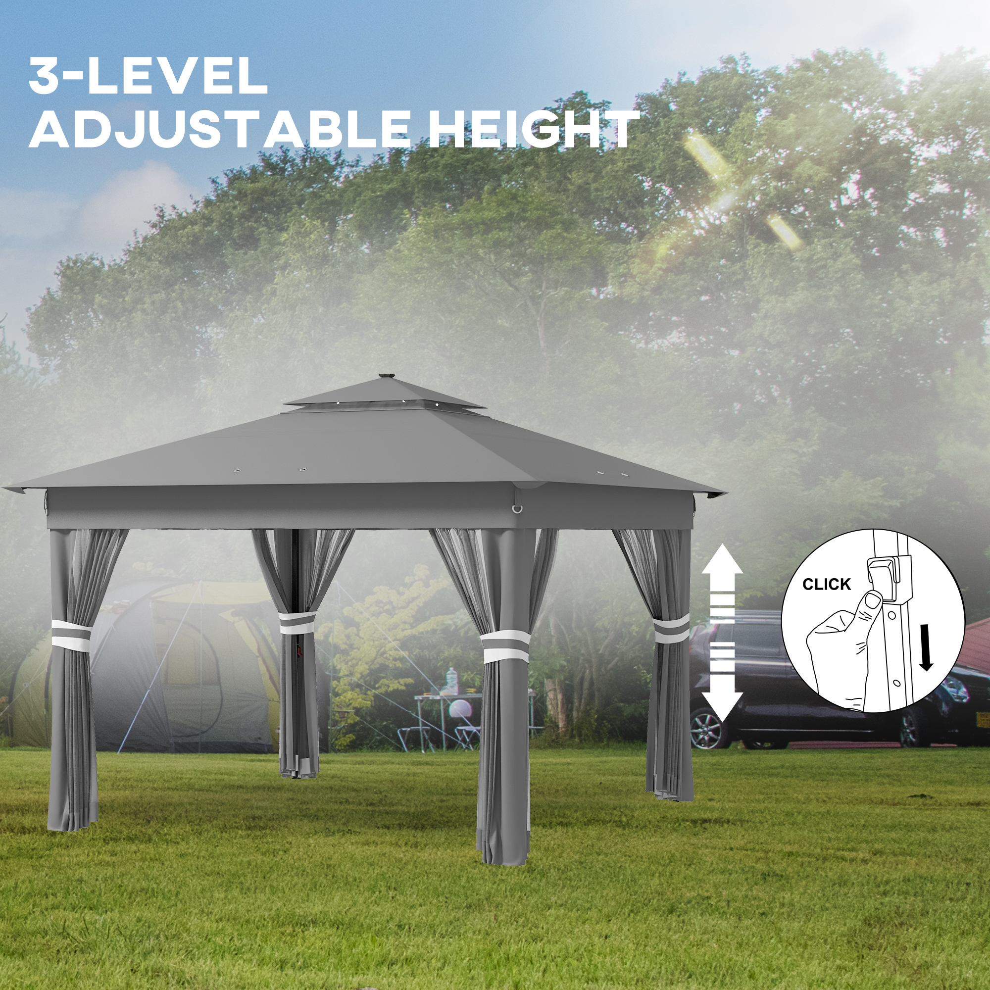 For day AND evening use, look to this Outsuuny pop-up gazebo with sides. It's fitted 16 solar-powered LED lights; charge in the day to use at night - no electricity required. A metal frame for a strong structure, which can be adjusted three positions between 250-270cm. Pop-up design so you can put it up and take down easily; take with you easily, wherever you want. Included remote control for on/off, brightness and mode adjustments. Wheeled carry bag included.