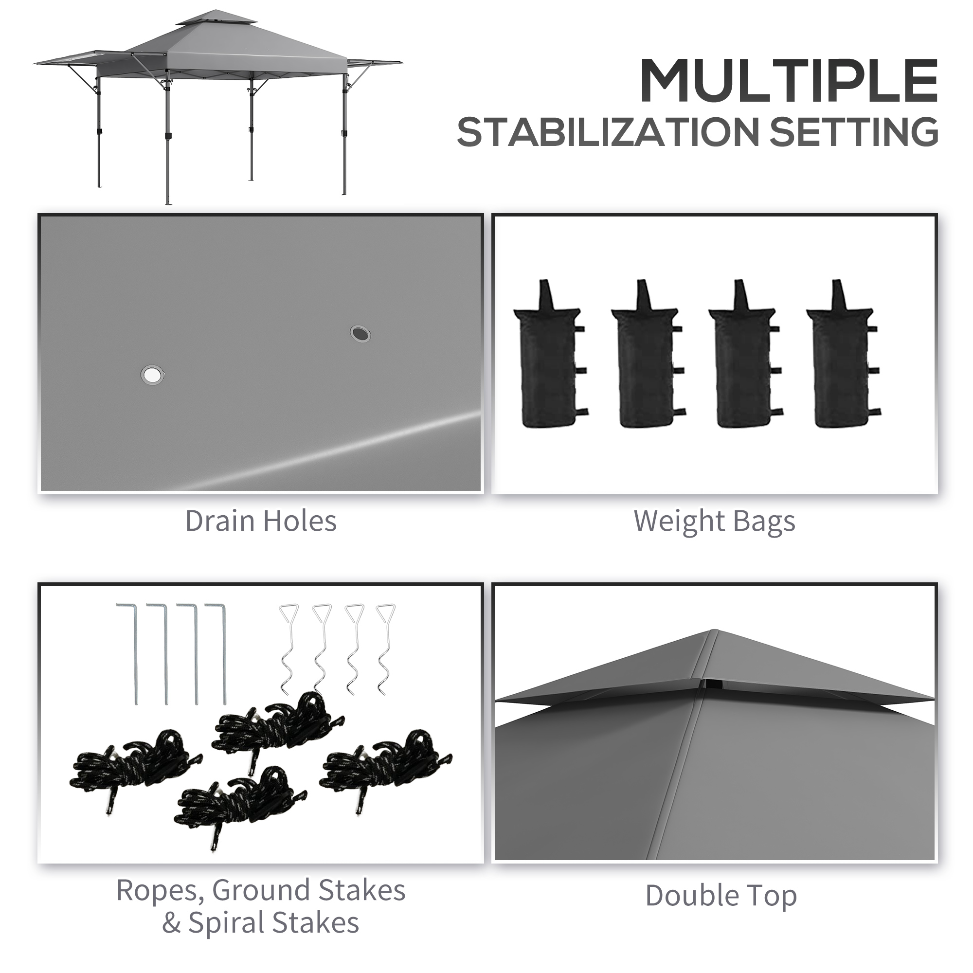 - Garden tent comes with 4x guy ropes, 4x ground stakes, 4x spiral stakes, 4x sand bags and a wheeled storage bag