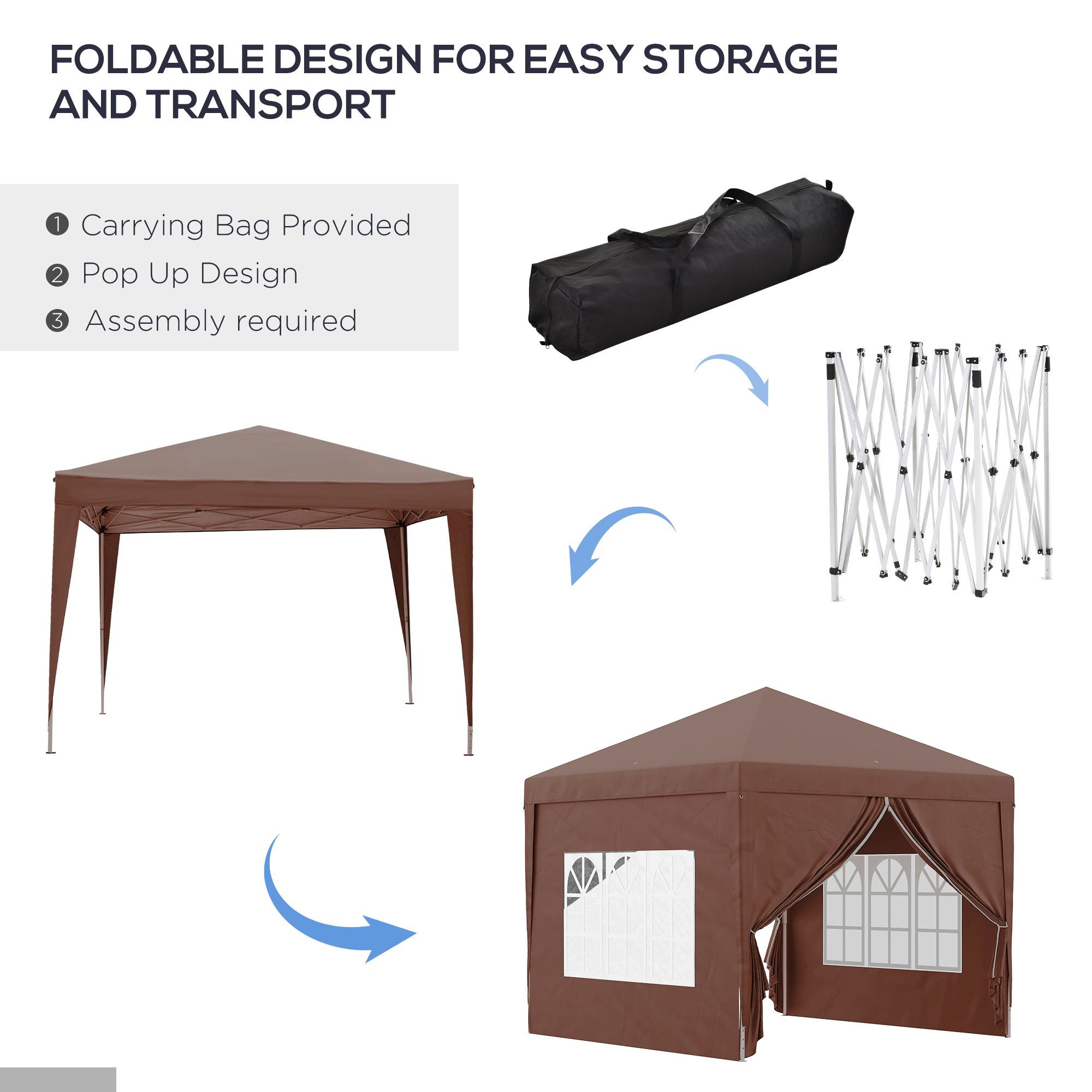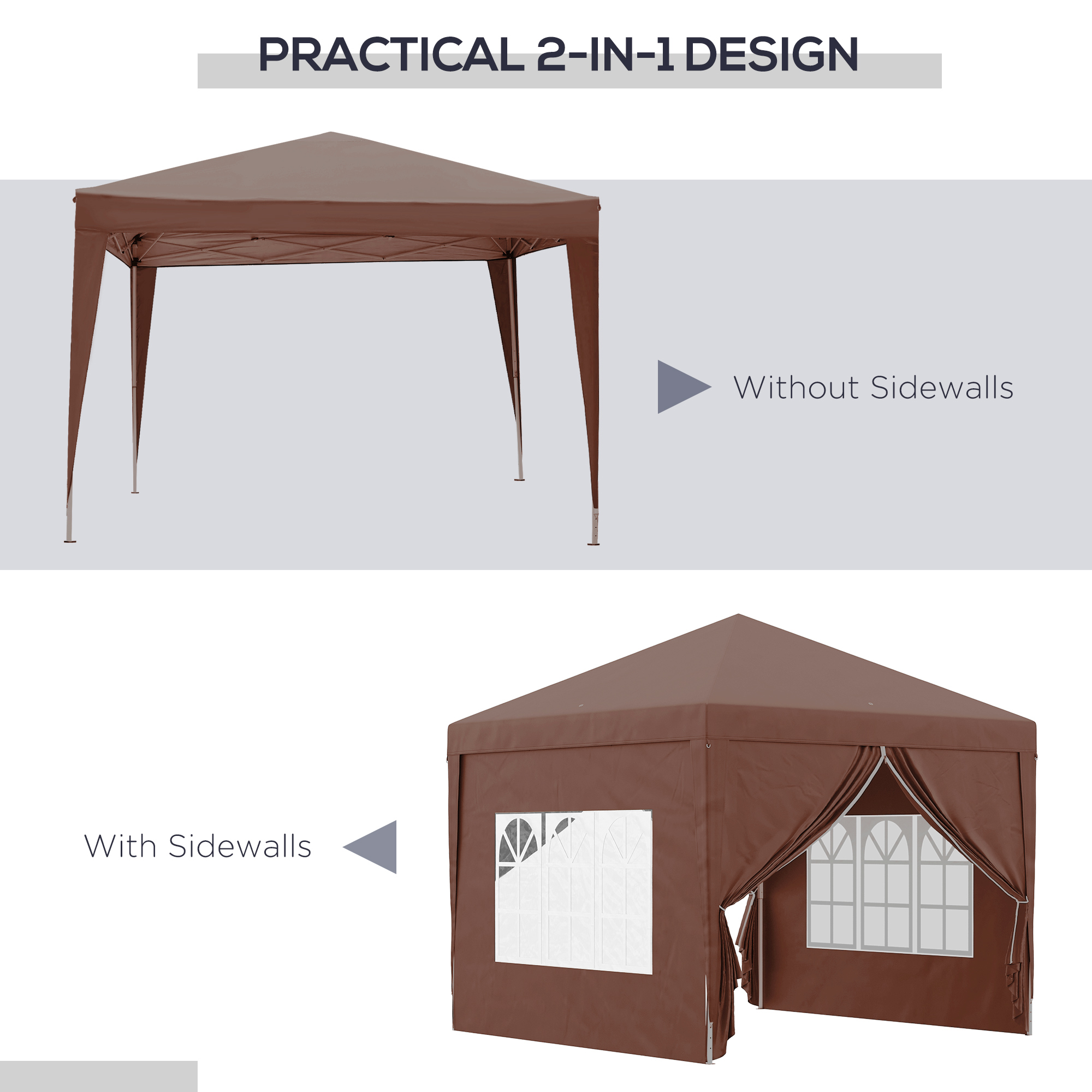 This Outsunny 3 x 3(m) gazebo is a great, no-fuss garden shelter. It is excellent for family parties, weddings, picnics, sports events, outdoor vendors, craft fairs, job sites and camping trips. The pop-up design makes it easy to set up and take down. The garden gazebo also comes with a portable carrying case. A powder-coated steel frame means a strong standing structure. With removable walls, you can create an open or closed atmosphere quickly and easily.