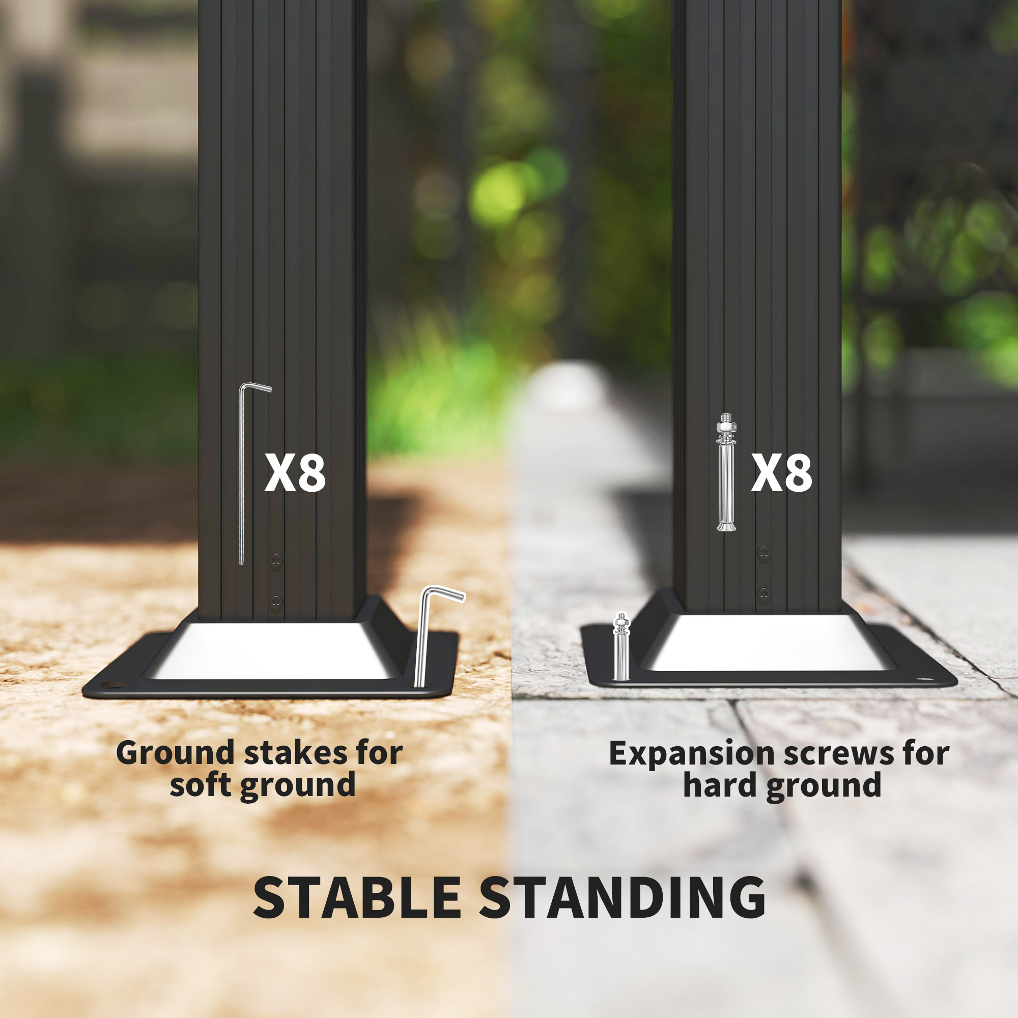 - Ground stakes and expansion screws included to pin to the ground