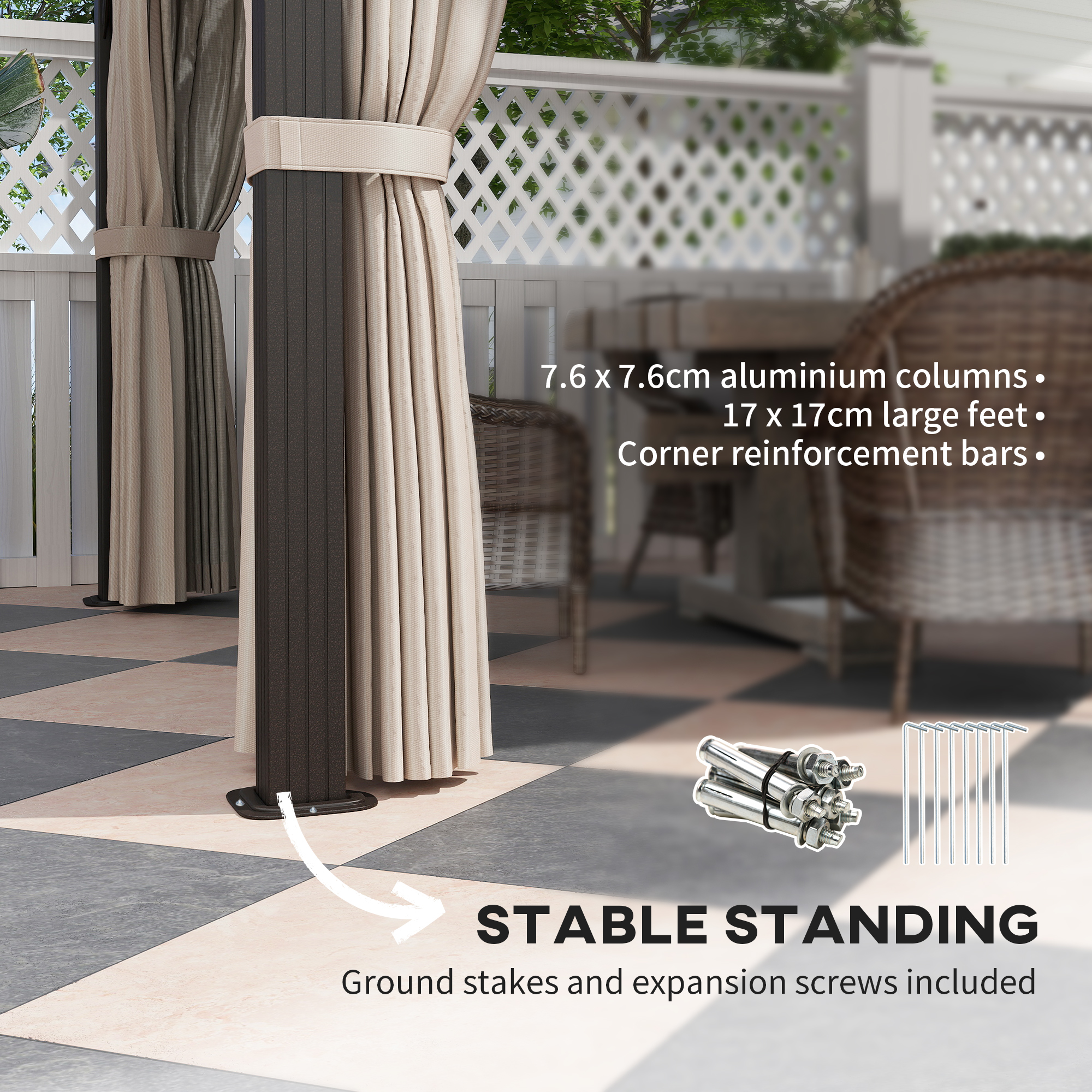 - 7.6 x 7.6 cm aluminium columns, 17 x 17 cm large feet and corner reinforcement bars for unmatched stability