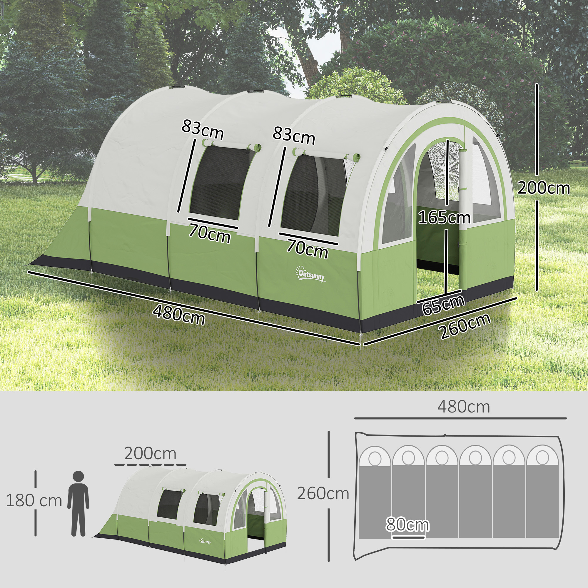 A spacious home for camping trips, thanks to this Outsunny six man tunnel tent. The fabric shell offers 3000 mm of rain protection, making it suitable for use in light to mild weather. The two room design comes with a main bedroom a living room: a place to sleep and another to relax. Friend and family tent is complete with an inner hook to hang a light inside, so you can see when dark. 28x ground stakes, 9x guy ropes and a carry bag included.