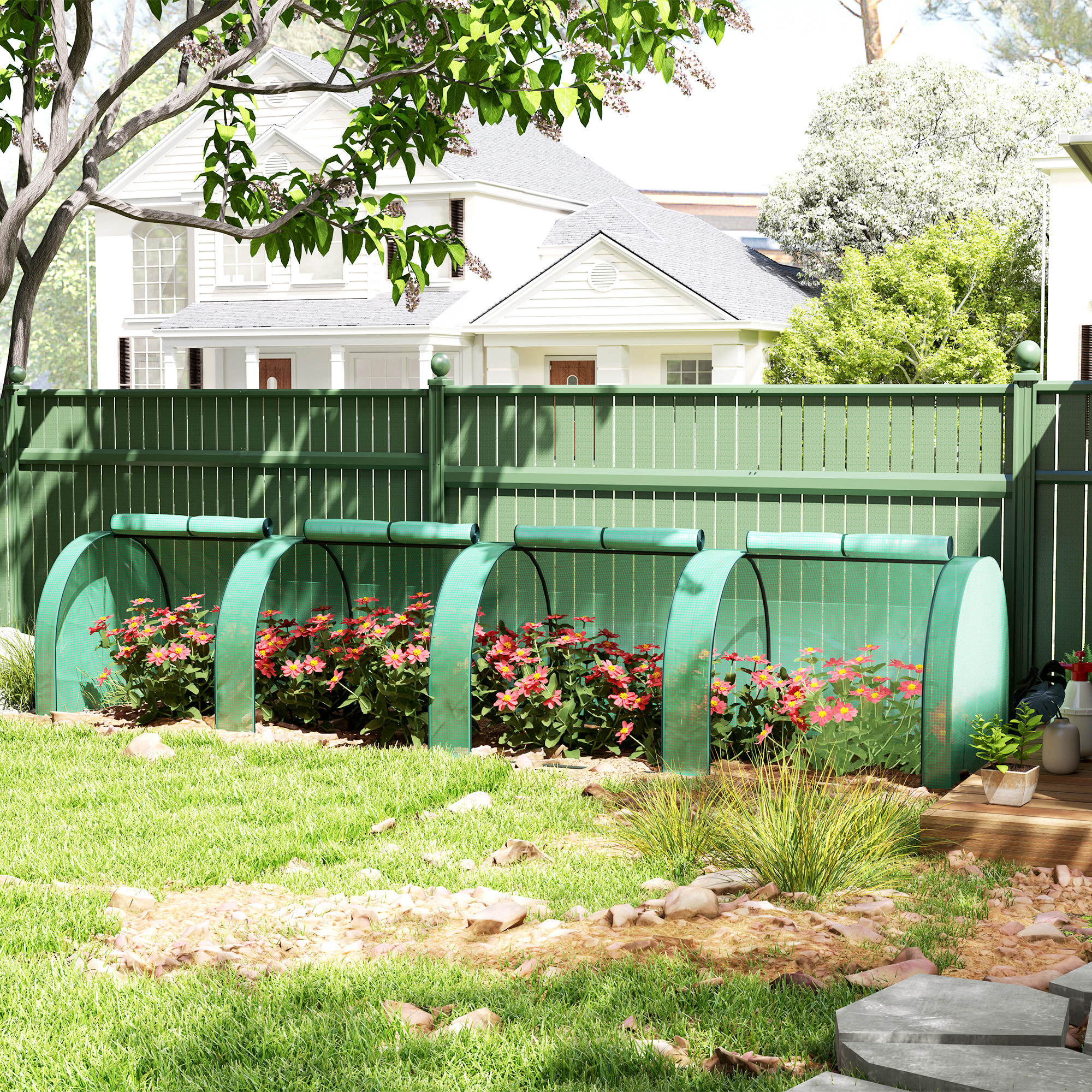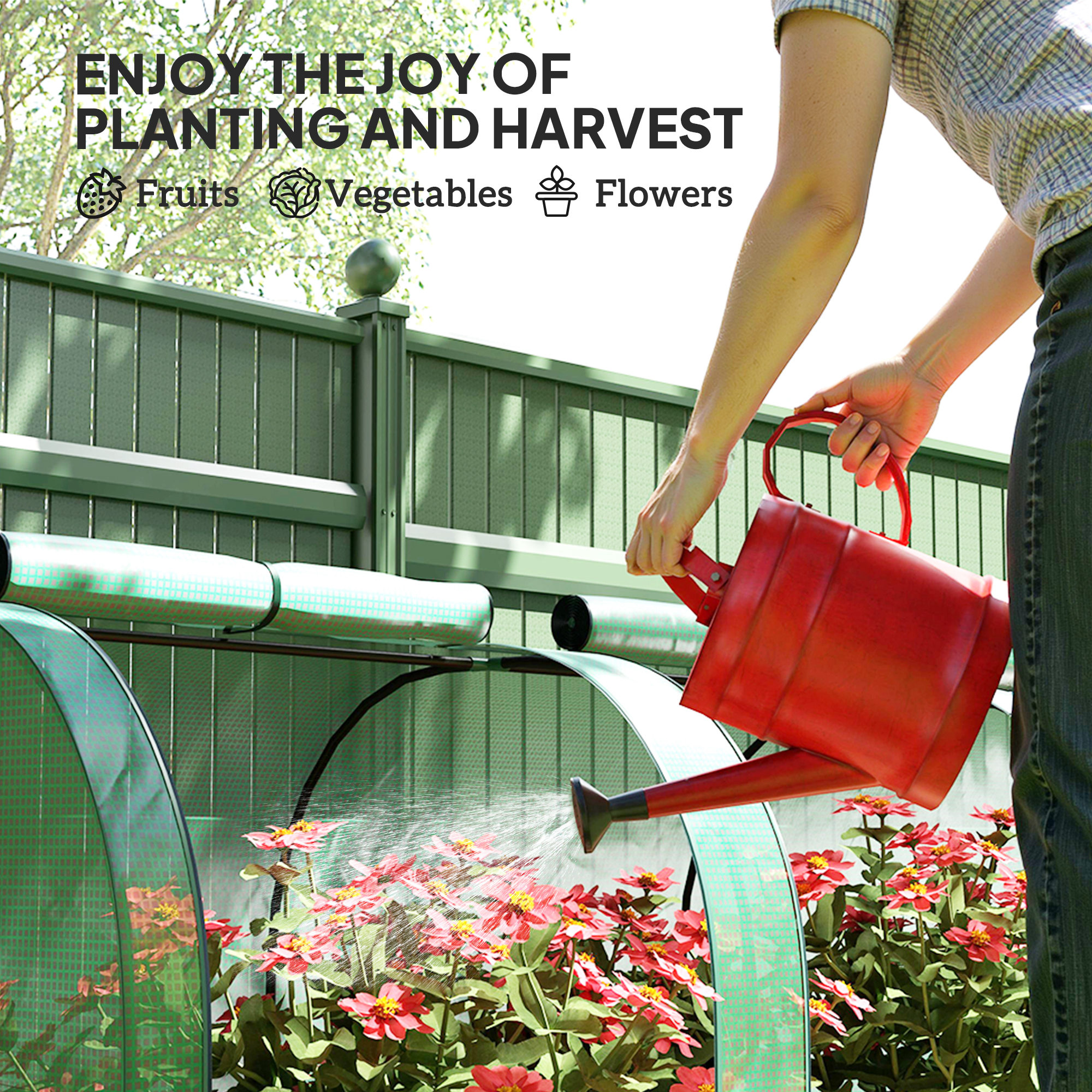 Grow plants, vegetables, fruit and flowers safely all year round with this Outsunny long tunnel greenhouse. The powder coated steel frame ensures a tough core, fitted with a plastic cover to protect plants from the weather and cold; also allows sunlight through to nourish them. It's complete with zipped doors, providing you easy access and ventilation throughout. Lightweight enough to be moved around, this greenhouse is perfect for gardens, patios, balconies.