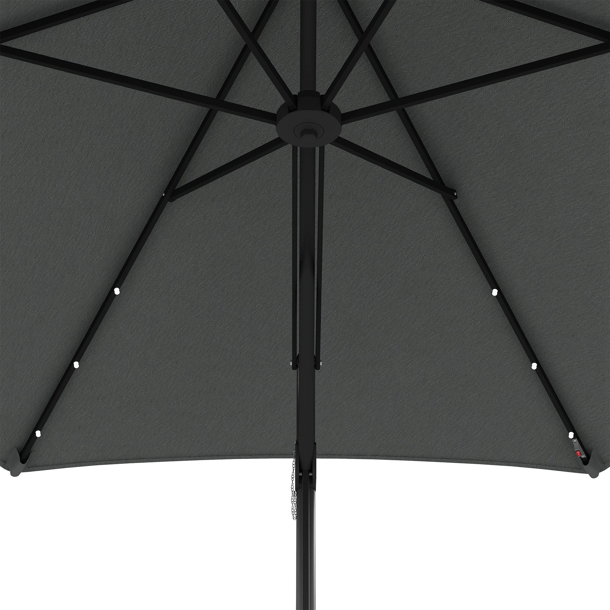 From day to night with this Outsunny parasol umbrella. Showcasing solar-powered LED lights on the ribs: charges in the day to light up at night; extend your outdoor time beautifully. Cross base included, 60kg required weights are required.
