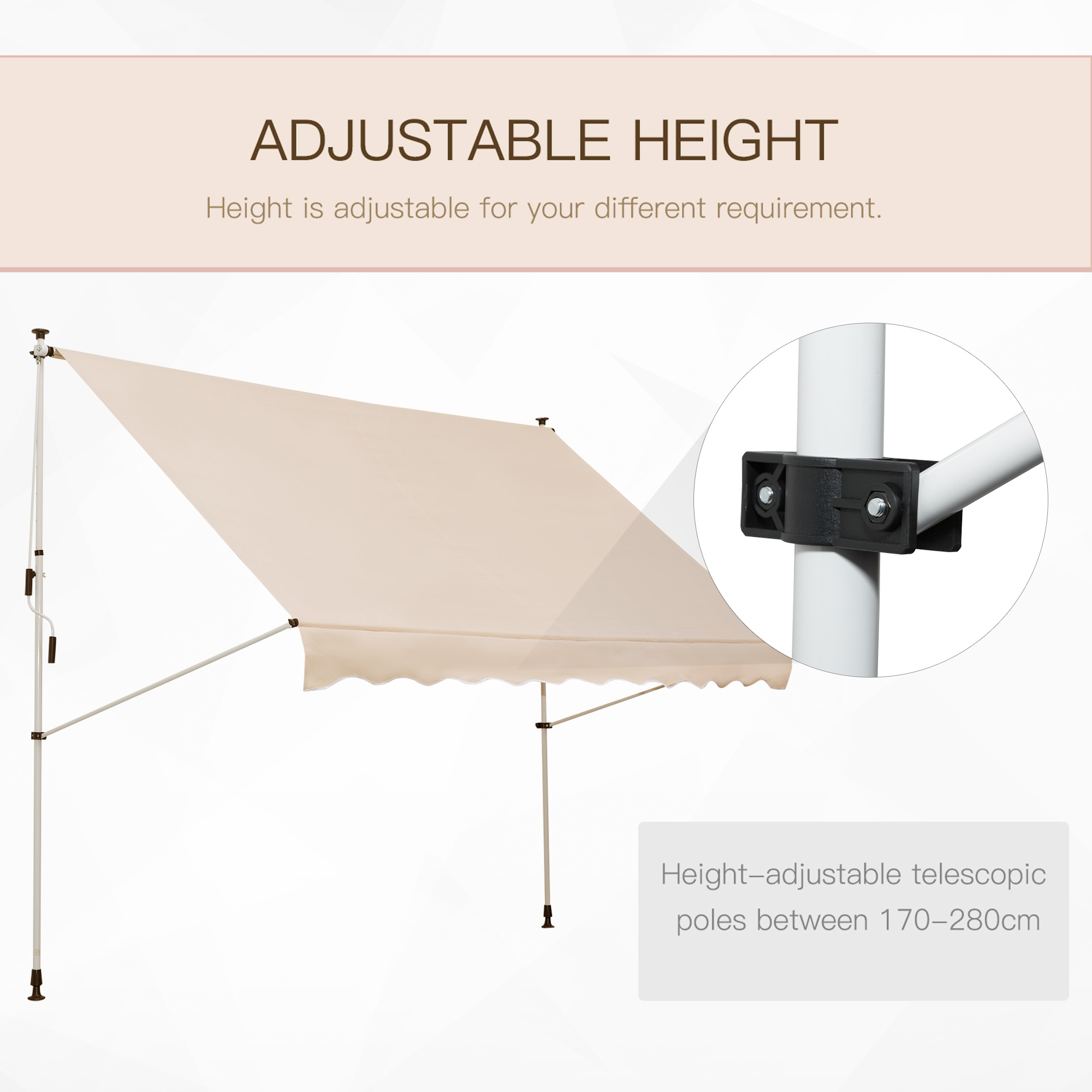 Bring shelter into your outdoor garden space when needed with this 300cm x 150cm beige awning from Outsunny. Easy to set up to save you time and effort, its ceiling-to-ground design makes it more stable and secure as opposed to a ceiling only awning, with the powder coated aluminium frame ensuring it is tough and durable for long-term use in your home. Manually operated via the crank handle, the canopy angle can be adjusted between 0 – 90 degrees, with the height ranging from 1.7 to 2.8m, allowing you to easily set it to a position which suits you, with the weather-resistant canopy shielding you from UV rays, the sun glare and light wind and rain. The best way to enjoy your garden even more all-year round.