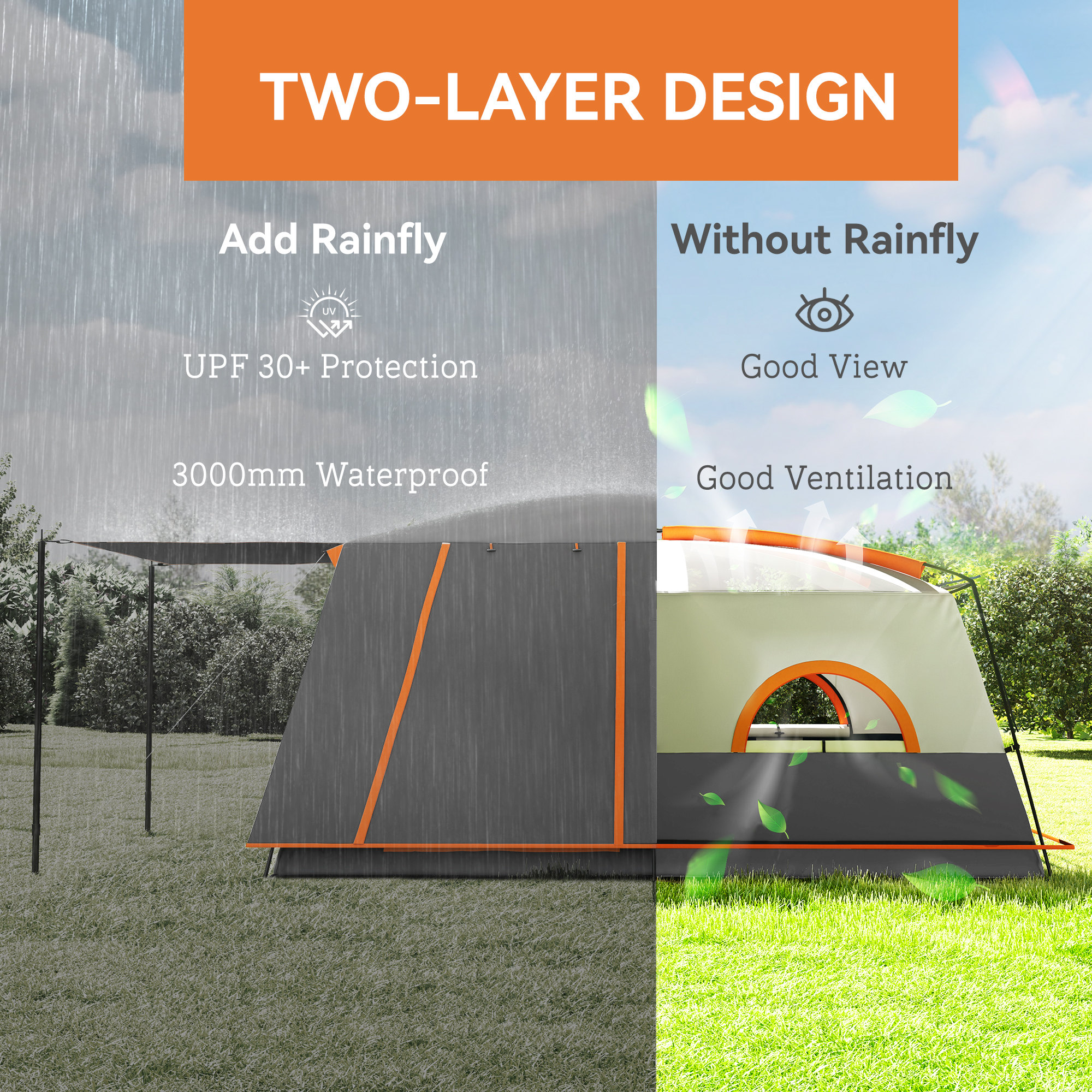 Discover the great outdoors with the Outsunny large family tent, a spacious haven for 4-6 adventurers. This 2 bedroom tent with porch merges comfort and durability, featuring a 3000mm waterproof and UPF 30+ outer layer, alongside a breathable inner layer. Enjoy lots of ventilation from side and rear mesh windows, making this big tent a great choice for family camping, hiking, or backpacking escapades.