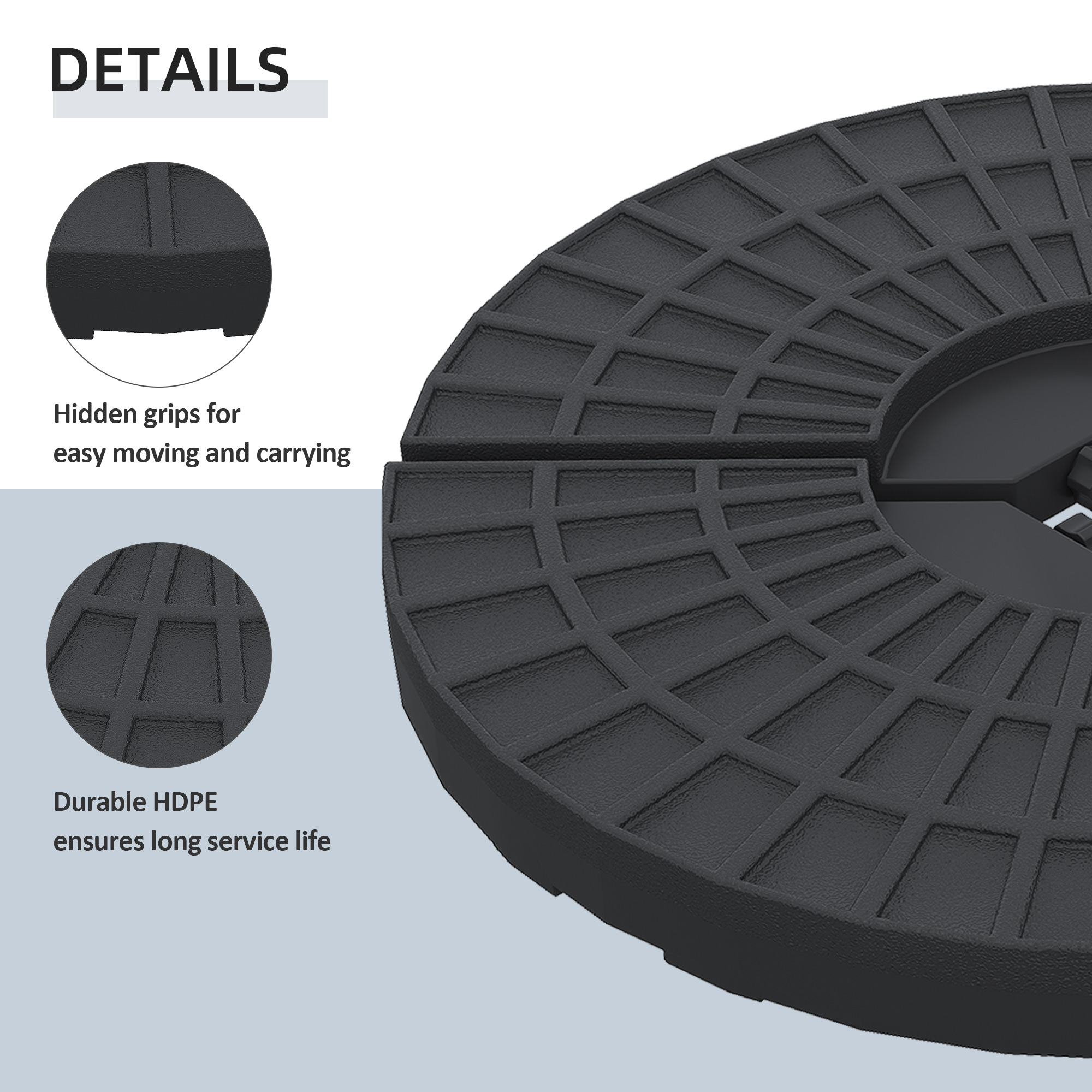 Ensure your parasol is always held firmly in place with parasol weights from Outsunny. Made from strong HDPE plastic, our weights for parasol are comprised of four pieces which fit together easily and each piece holds up to 13kg of water weight and 15kg of sand weight. When empty, the parasol base weights are light enough to carry around, allowing you to pick your perfect sunshade spot with ease, and these parasol bases can also be cleaned quickly. Whether you wish to use this for your garden or coffee shop, this patio umbrella base is suitable for you.