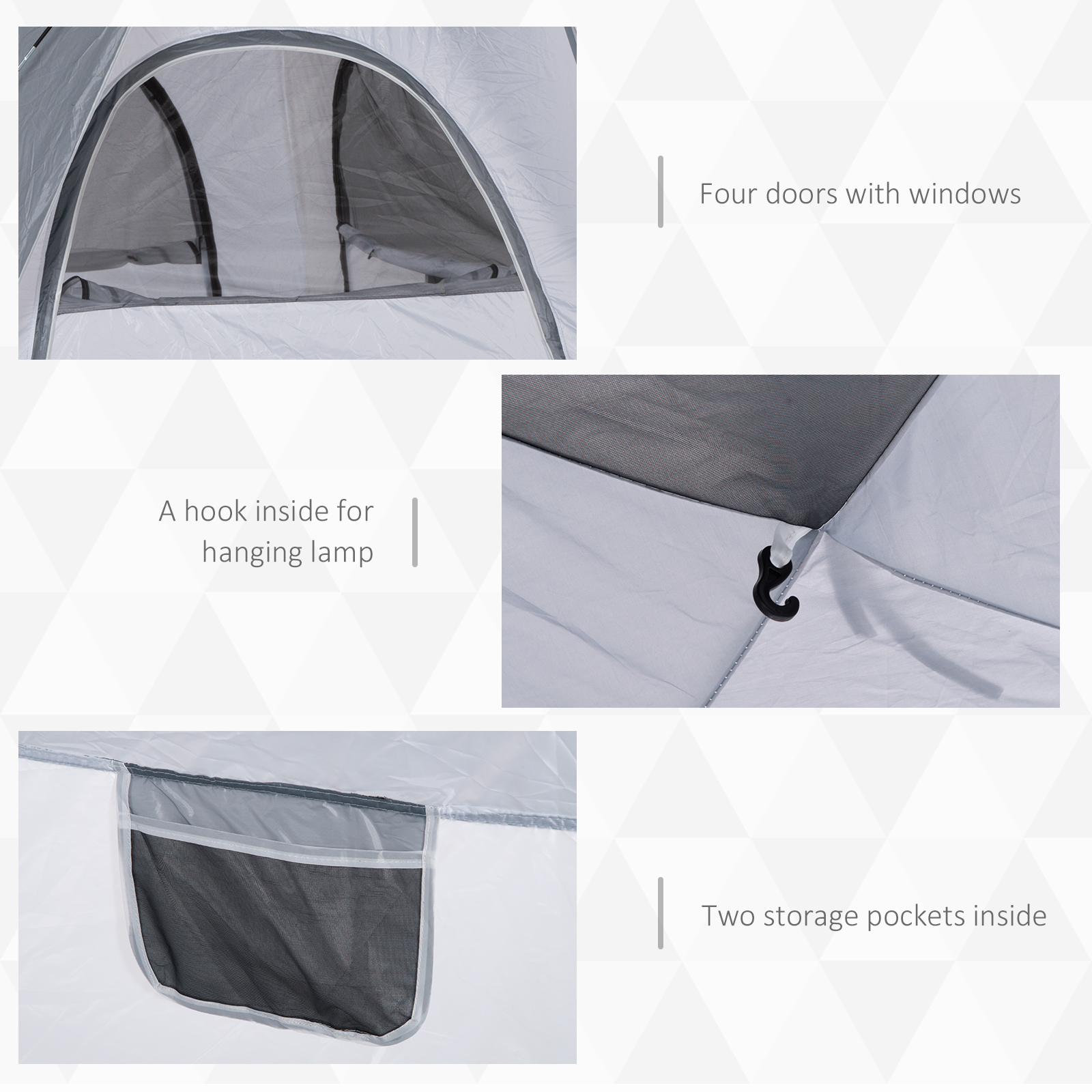 - Four windows for ventilation, large door to enter and leave tent easily