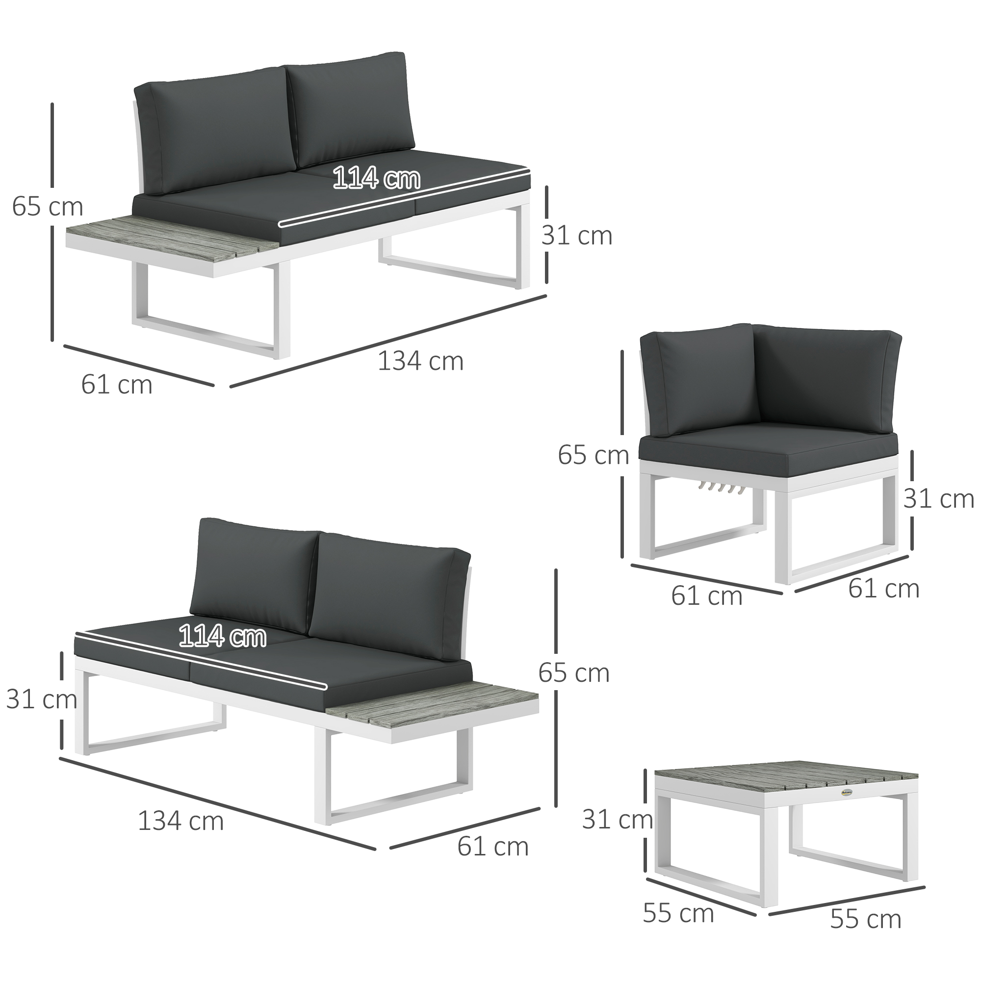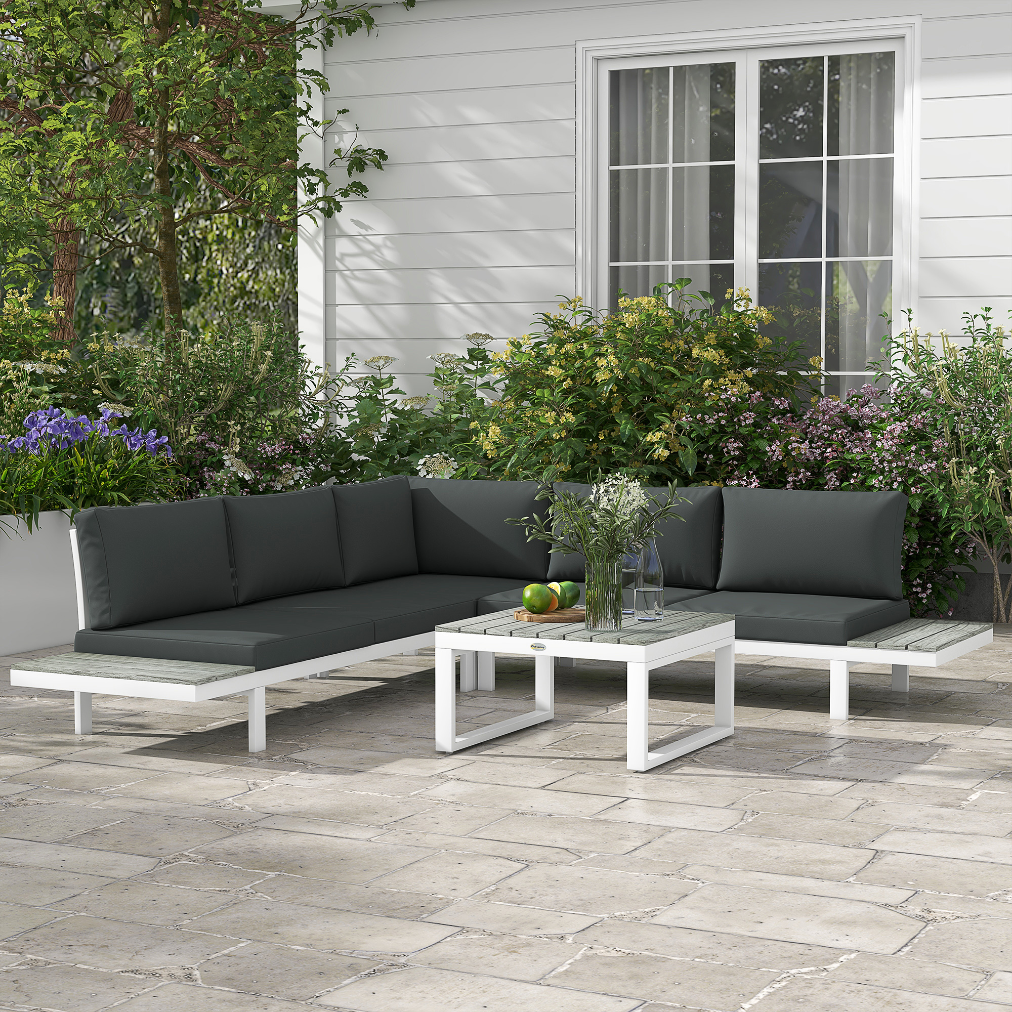 Enjoy the outdoors in style with this Outsunny outdoor furniture set. Comes with two loveseats, a corner seat and a matching coffee table. Powder coated steel means each piece is strong, with the padded cushions keeping you comfortable. The small table included means a handy holding place.