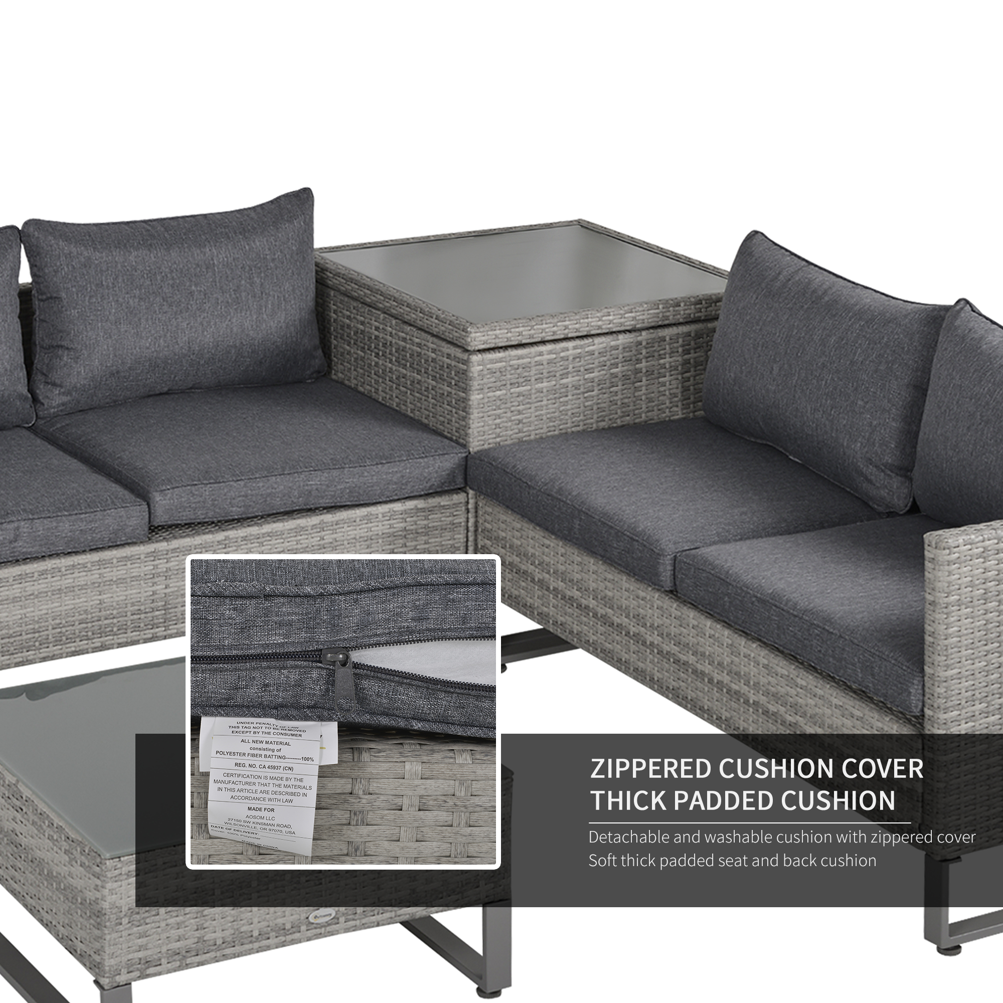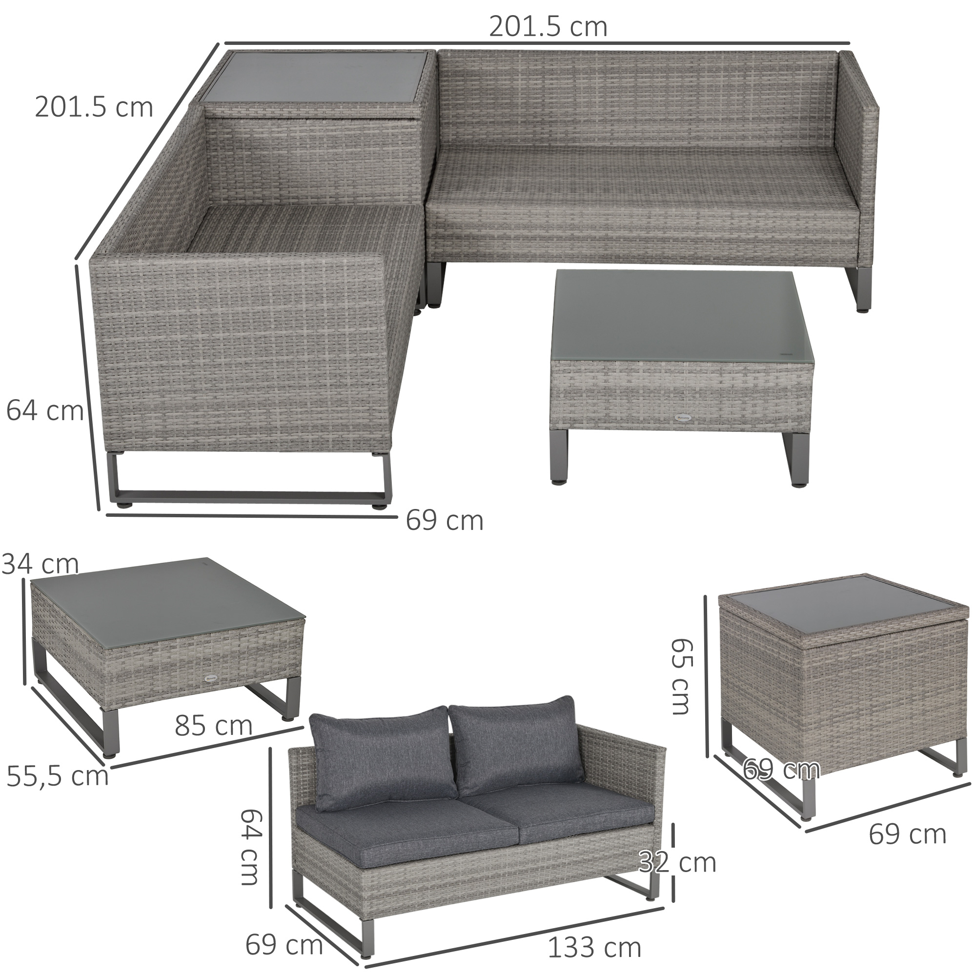 Keep comfortable in a tidy and stylish spot outdoors which this seating set Outsunny. It comes with two loveseat sofas, a corner storage table and large table. The frame of each piece is made from powder coated metal for a tough core, wrapped in PE rattan for extra protection. Sofas come with seat and back cushions to keep you comfortable; both tables are fitted with tempered glass tops for a solid holding spot for everything you need close to you. Easy to maintain and stylish, this is a fantastic outdoor lounging set to see you through the season and beyond.
