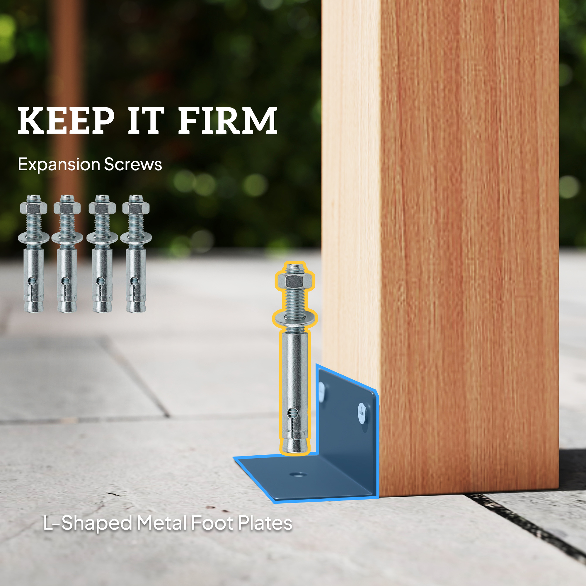 - Comes with L-shaped metal foot plates and expansion screws for stability in up to level 7 winds