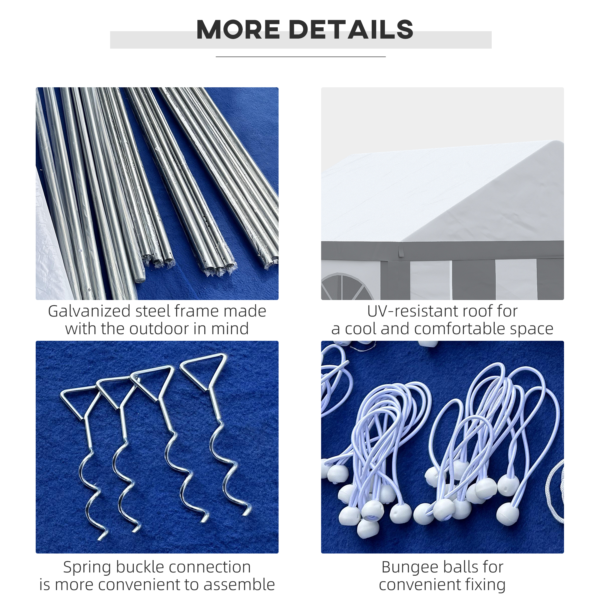 - Four guy ropes, four spiral stakes and 12 ground stakes included to pin to the ground