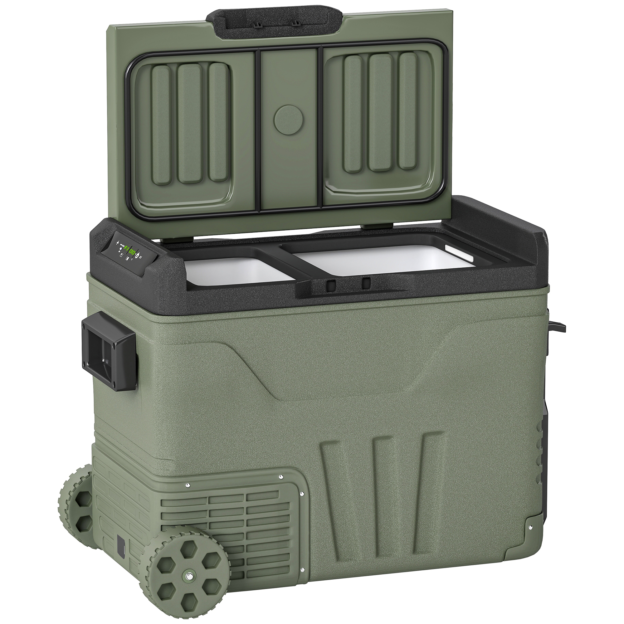 Discover the convenience of the Outsunny electric cooler box with dual storage zones to minimise odours and a hefty 45-litre capacity. Easily transportable with foldable handle and robust off-road wheels, this 12v cool box adjusts from -20℃ to 20℃ with a simple touch on the LED panel, ensuring your goods stay chilled with energy-efficient LOW mode or rapid cooling options. Complete with a car and home power cable so you can use it in plenty of places.