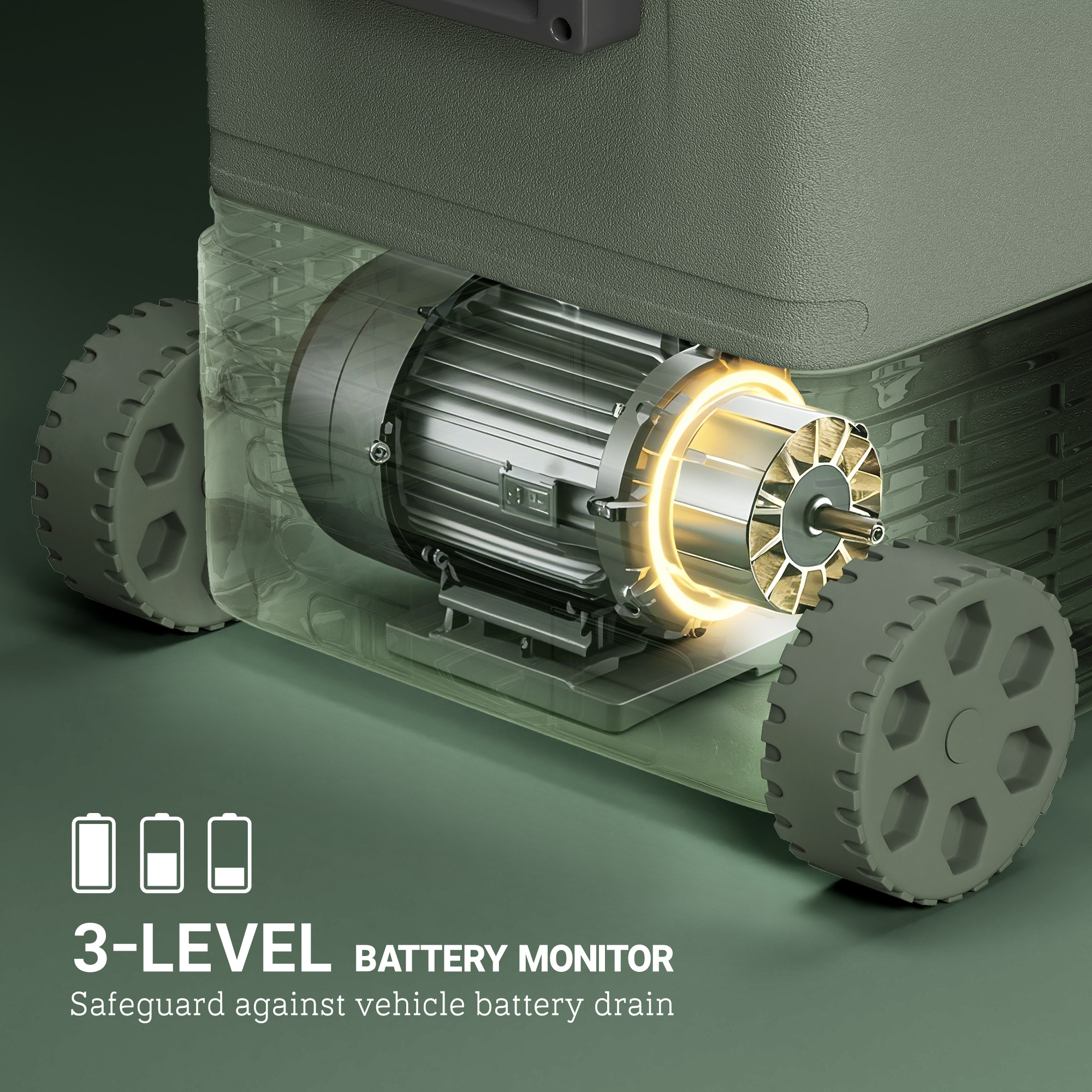 - Battery protection settings (Low, Med, High) prevent vehicle battery drain