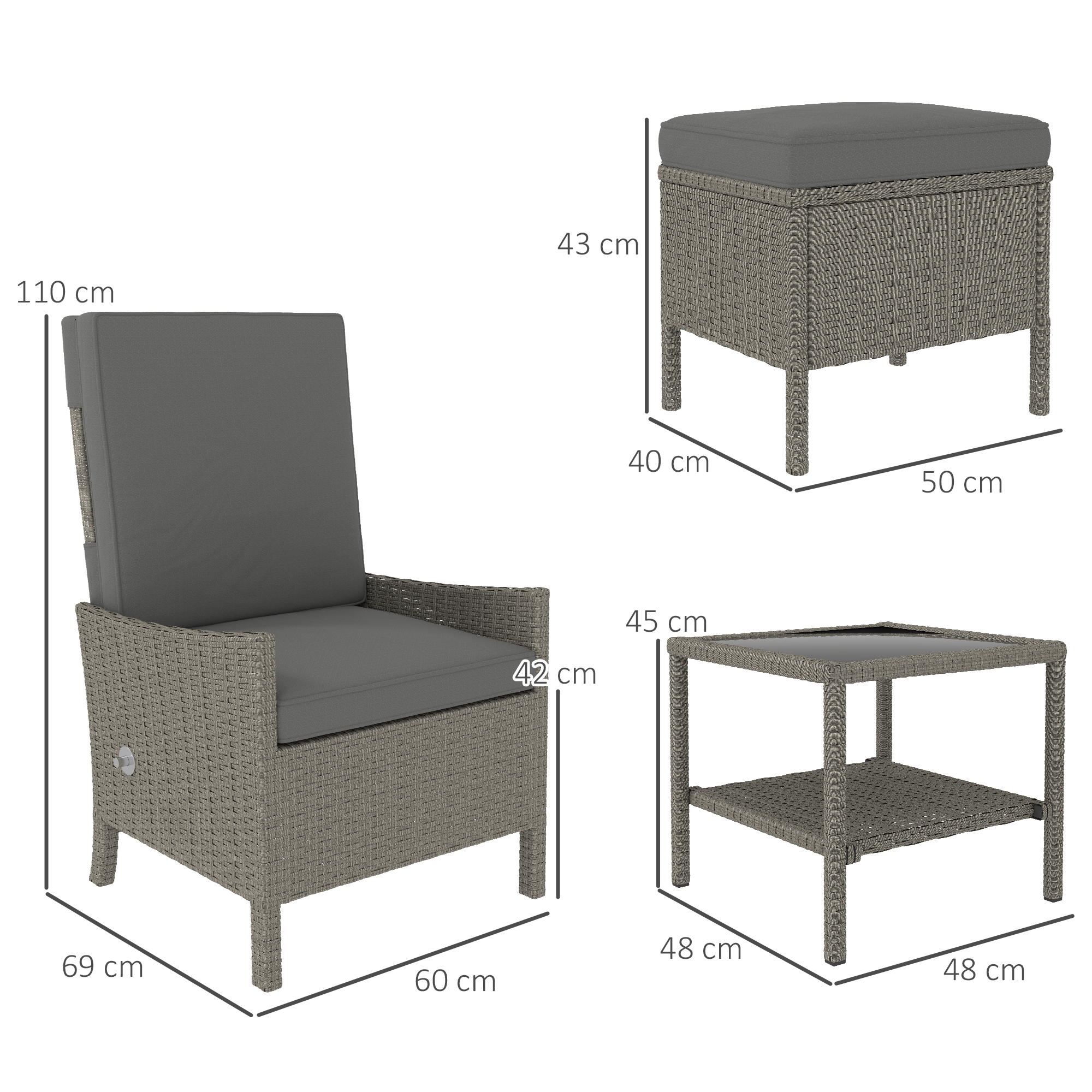 - Weight Capacity: 30 kg (Table), 120 kg (Armchair/Footstool)