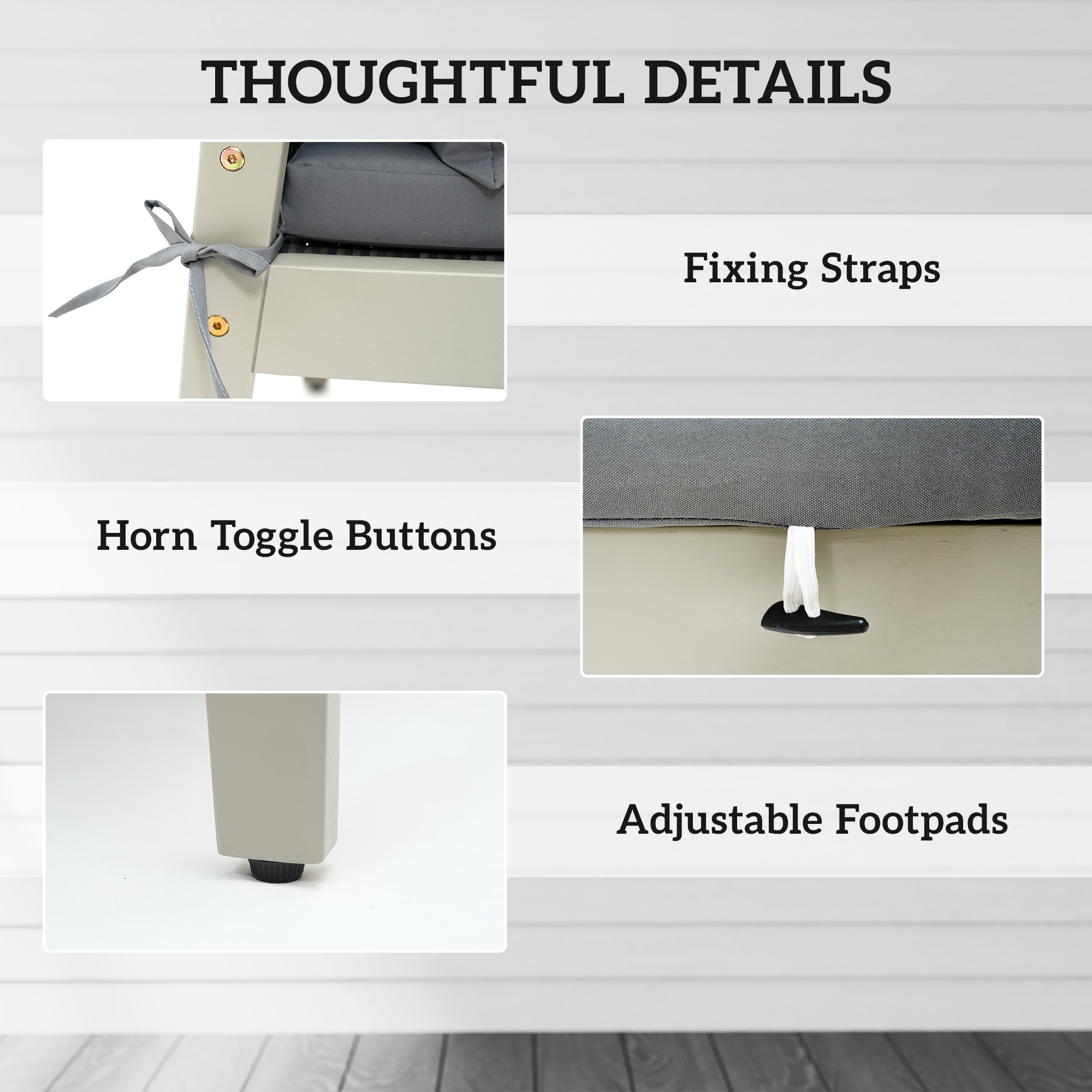 - Horn toggle buttons keep footstool cushions securely in place