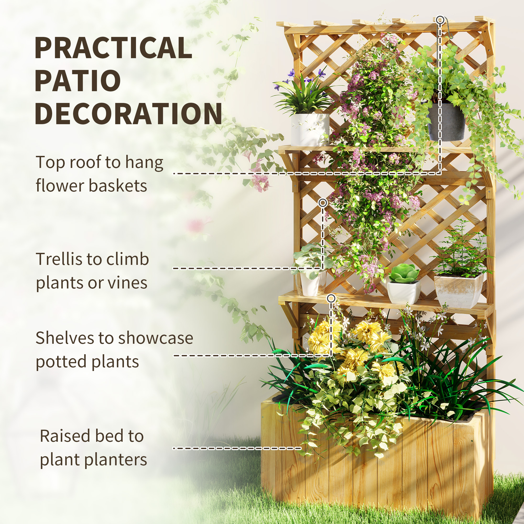 Even more greenery comes to life with our Outsunny raised planter. With a 146.5 cm trellis and two shelves, there's extra growing space for climbing plants, vines and plant pots. Made from fir wood, this planter is a naturally tough piece suitable for outdoor use, all year round.
