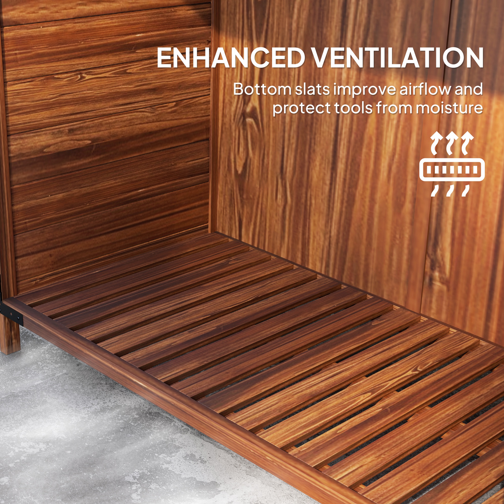Keep garden tools neat, tidy and always within reach with this Outsunny 103.5 x 59 cm shed. Inside there is an upper and lower shelf - storage room for plenty: gardening tools, cleaning supplies, boots, pots and more. It features a slatted base for airflow, to help keep the inside of this shed fresh and aerated; in turn helps keeps contents dry. A must-have functional and stylish addition to any garden.