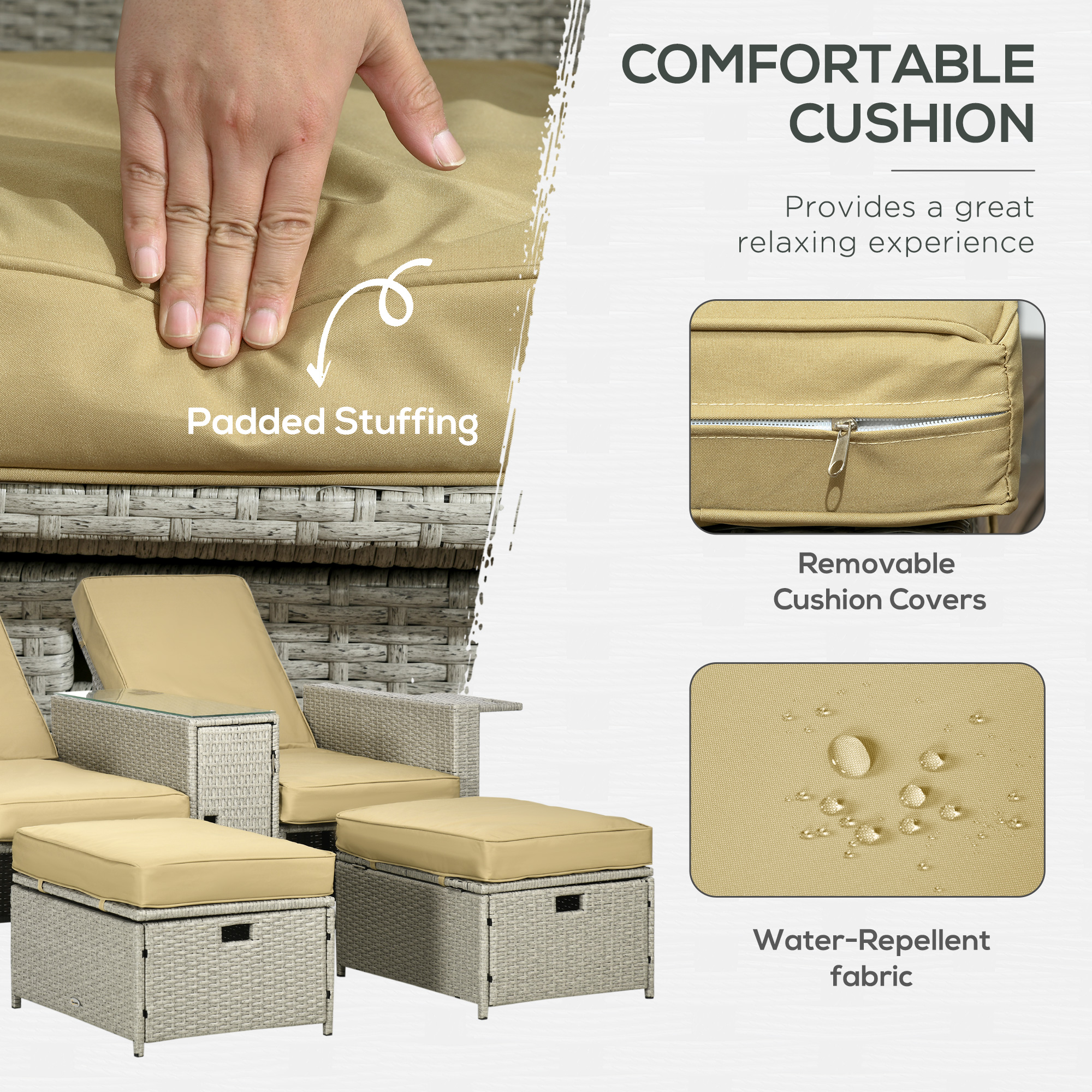 This Outsunny set combines reclining garden furniture, with storage and most importantly, somewhere to relax with a friend. It comes with two reclining chairs, two storage footstools and a tempered glass-top table. Both chairs feature a reclining back: set to five different angles so you can relax the way you want to. A steel frame forms each piece for strong support, wrapped in stylish plastic rattan: a garden-ready look to be used this season and beyond.