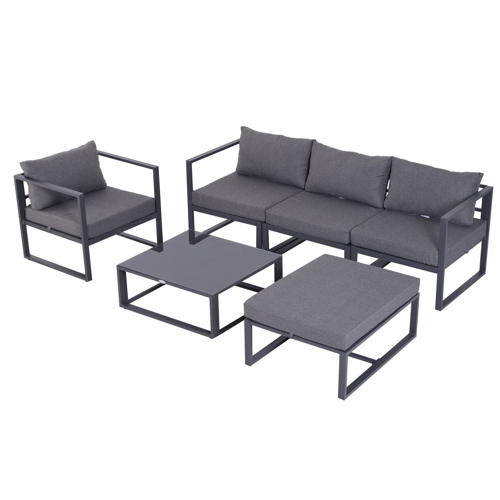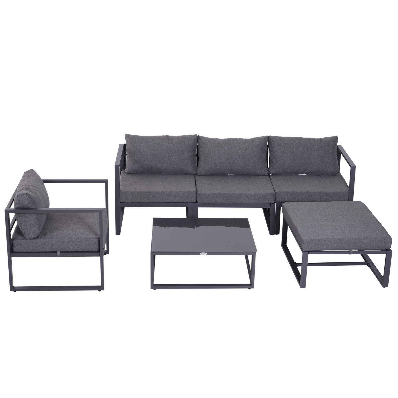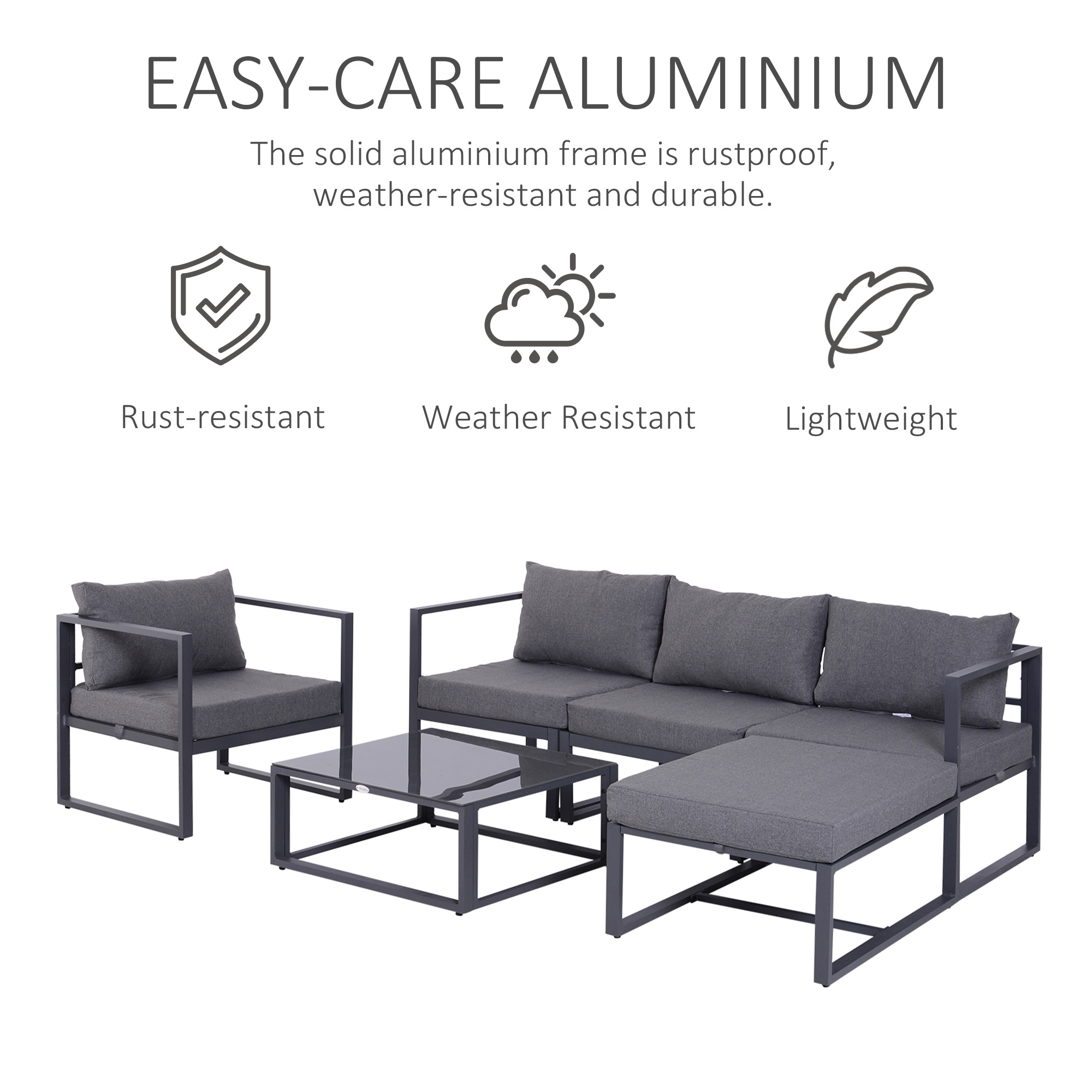 Understatedly stylish and extremely comfortable, this six-piece garden sofa set has it all. The set is made up of a armchair, a middle seat, two corner seats, a large footstool and a table, with all pieces made with a powder-coated aluminium frame for long-lasting use and strength. Plush padded cushions on the seats ensure all day comfort and the covers can be taken off and washed. With a tempered glass top, the coffee table adds a sleek finishing touch to the set.
