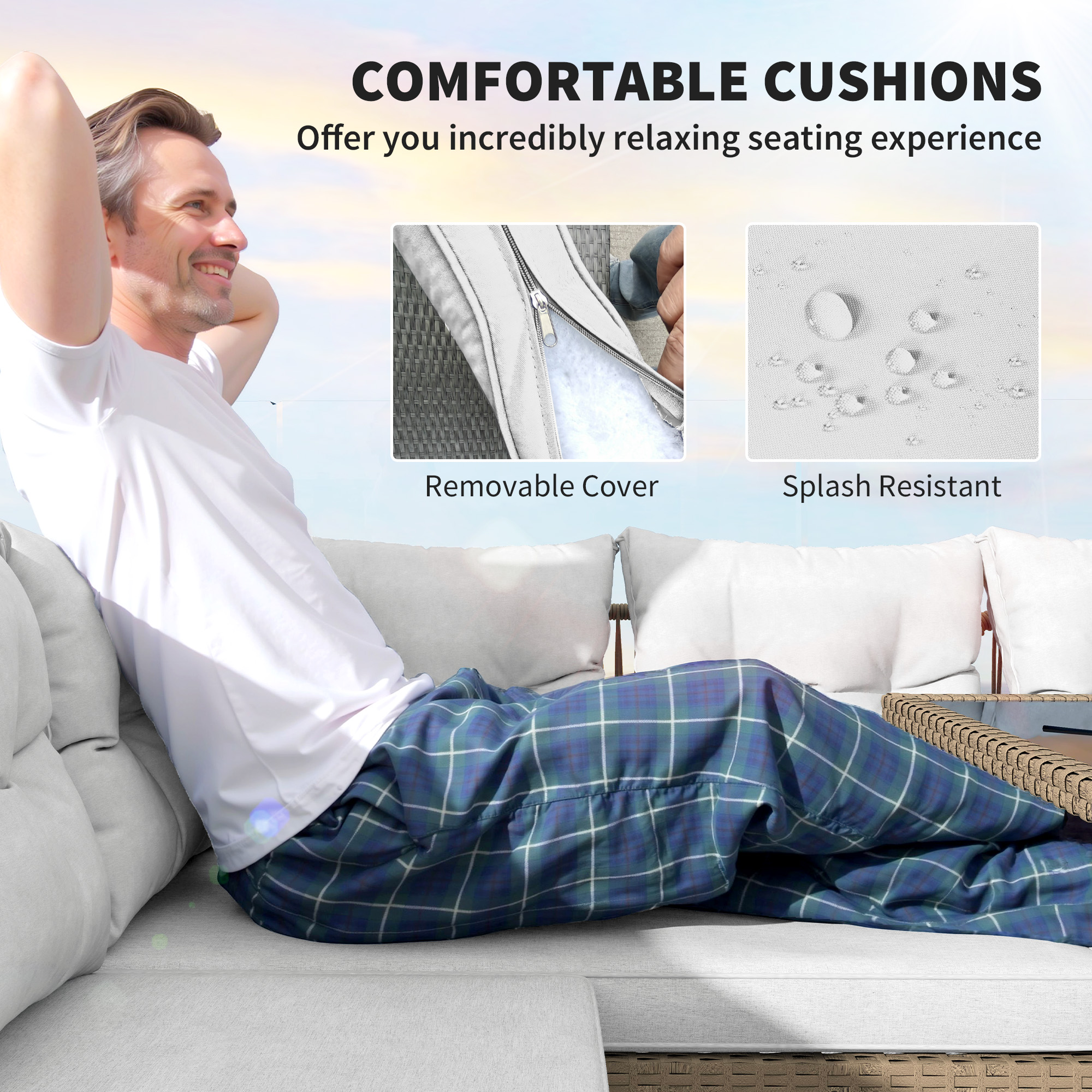 Transform your garden into a relaxing haven with the Outsunny 6-piece garden sofa set. This versatile outdoor garden furniture includes two left/right-hand sofas, a cosy corner sofa, a table and two stools, all designed for customizable configurations. Crafted with robust steel and wrapped in all-weather wicker PE rattan, paired with plush cushions, it's a great choice for outdoor lounging.