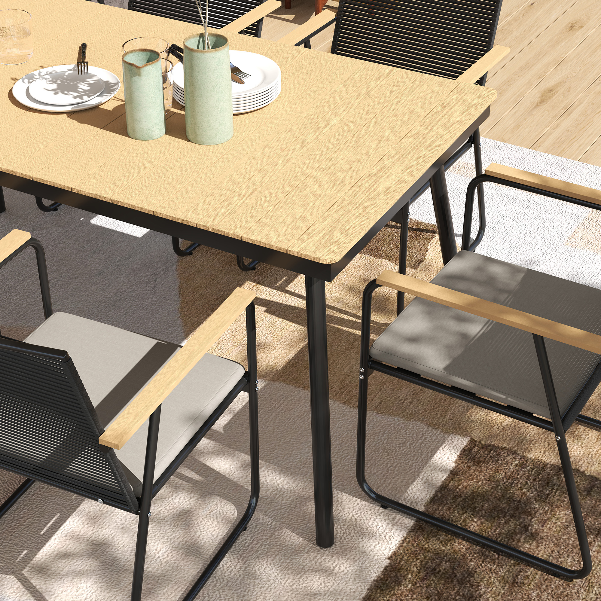 Transform your outdoor space with this stylish Outsunny 6 seater garden table and chairs! Each chair is equipped with a comfy padded cushion for hours of relaxation, while the wood plastic composite tabletop resists weather damage, ensuring durability. Suit for al fresco dining, it combines comfort, practicality and modern elegance, making every meal an unforgettable outdoor experience.