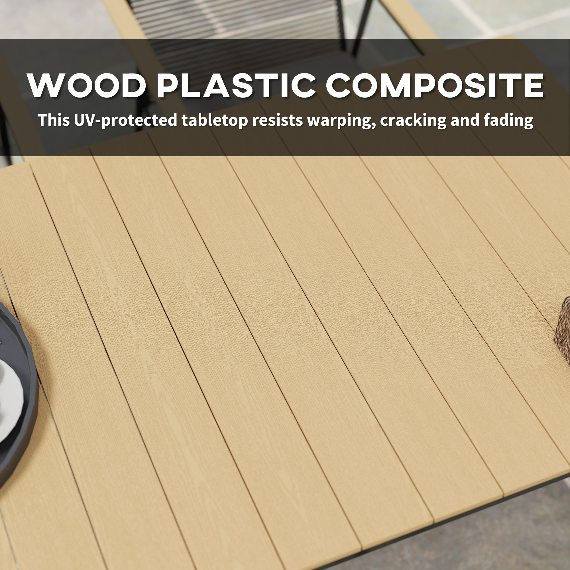 - This weatherproof tabletop is low-maintenance and easy to clean, with a stylish wood grain