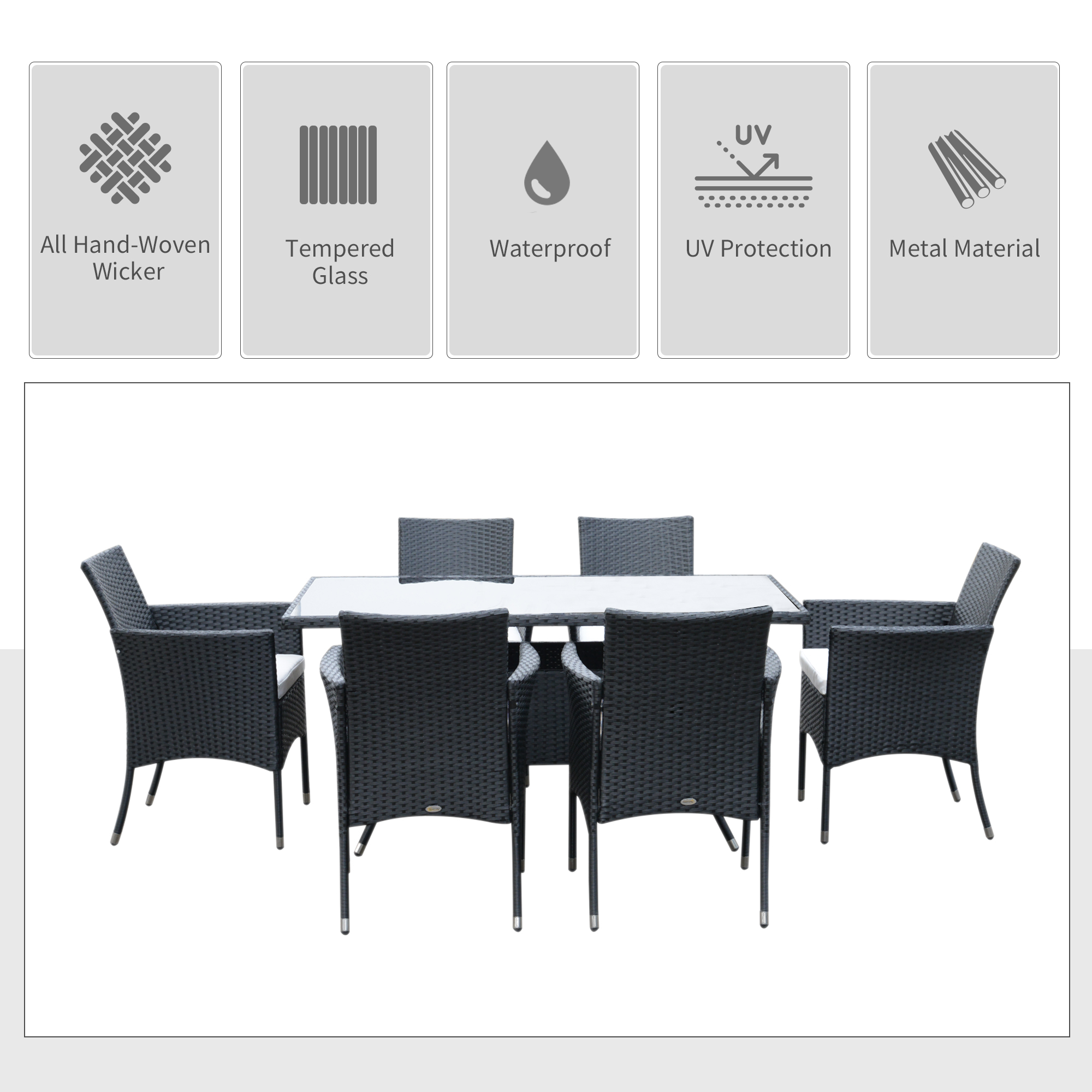 Transform your outdoor soirées with the exquisite Outsunny six-person rattan dining set, designed for those who cherish gatherings. Crafted from premium PE rattan and robust steel, this set promises durability against the elements, ensuring it remains a staple in your garden for years. The plush seating offers unparalleled comfort, perfect for long evenings of dining and conversation. The tempered glass tabletop not only enhances the aesthetic appeal but also simplifies post-event cleanup.