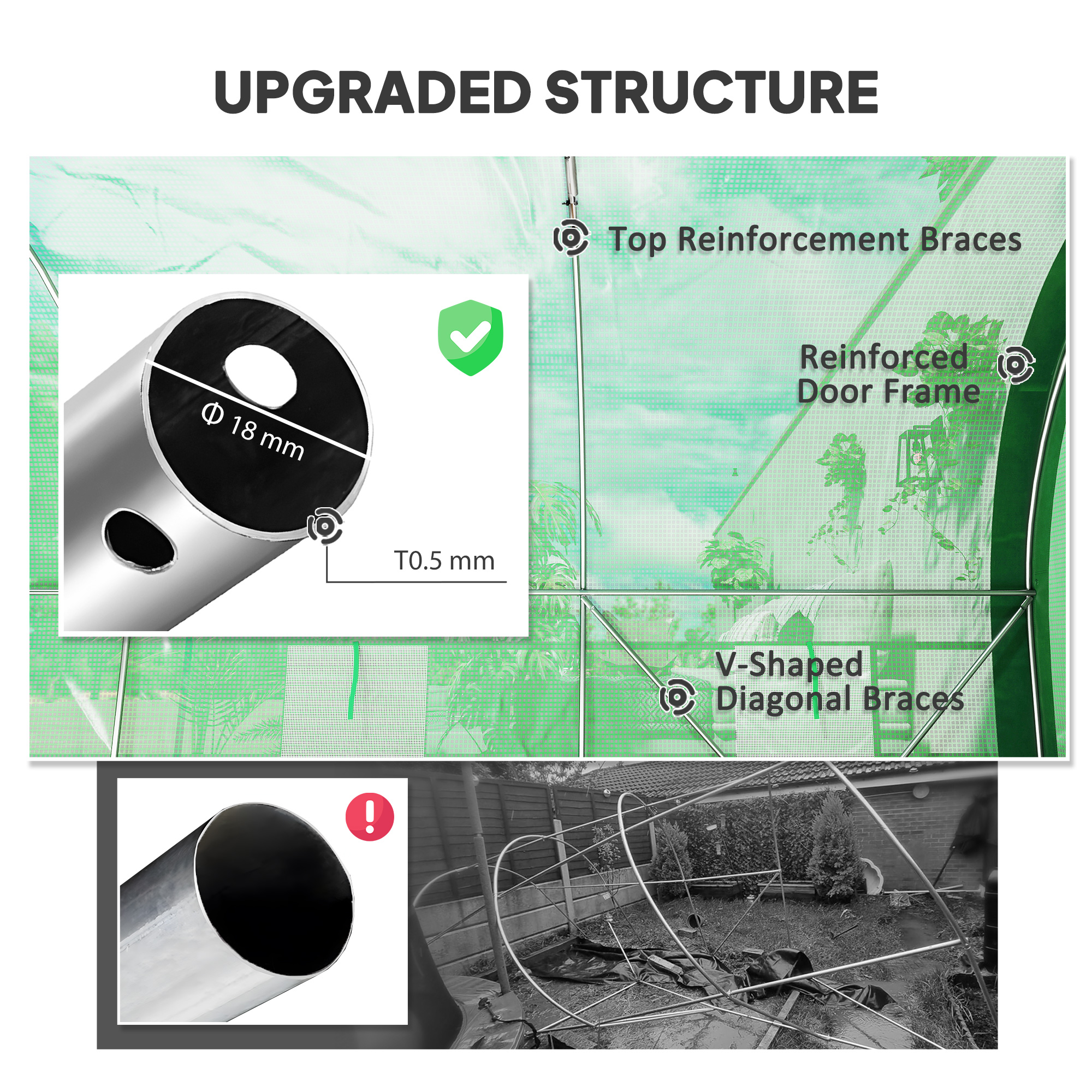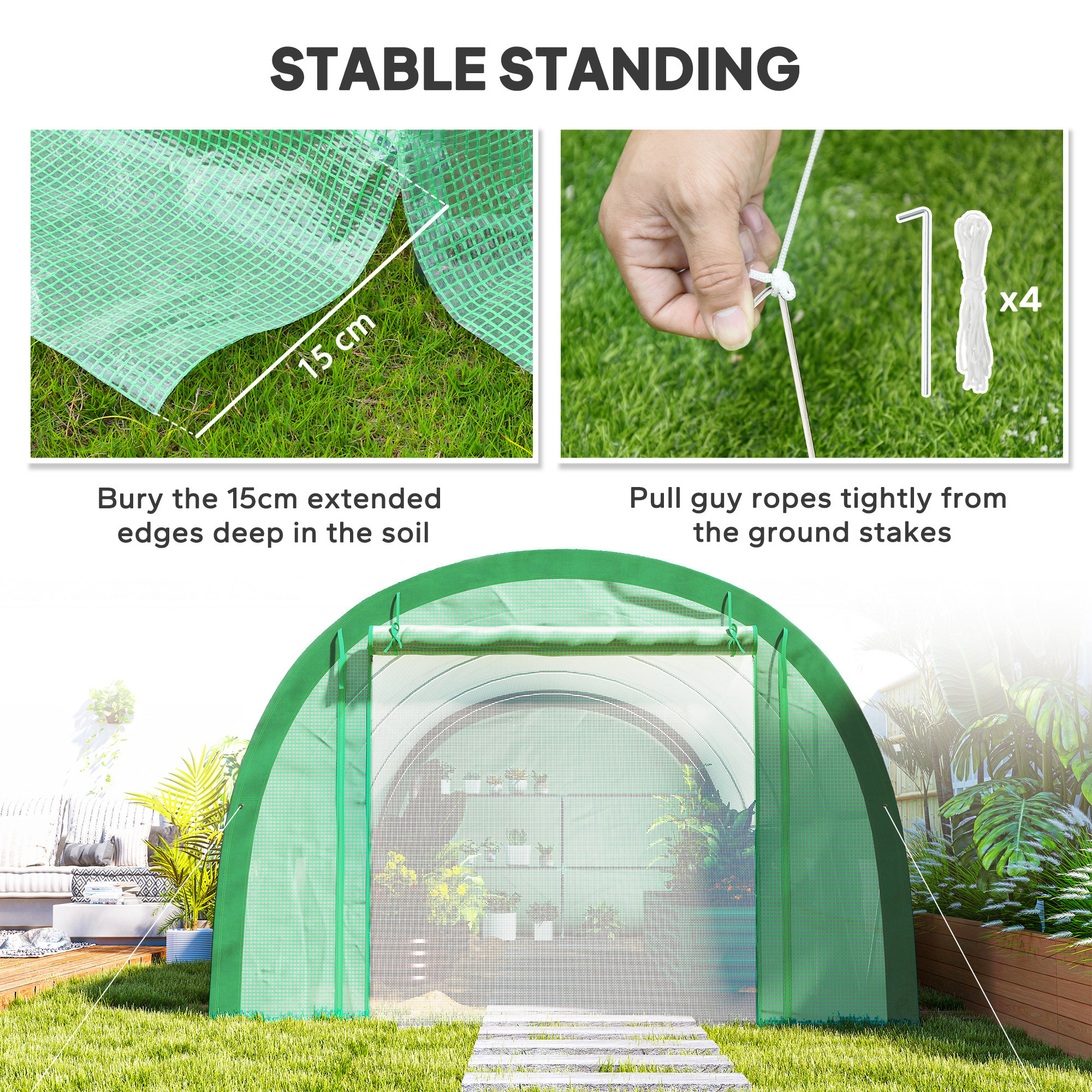 A large open design, this Outsunny 6 x 3 m polytunnel greenhouse offers plenty of room for plants and more. Walk in and walk out - it's that spacious. A galvanised steel frame for a strong core, it comes with a two-layer mesh cover to create safe shelter inside; the middle reinforcement makes the cover extra tough. A large door for easy access, with eight windows to bring fresh air in easily. Set comes with 4x ground stakes, 4x guy ropes, 15x plant labels and 1x pair of gloves.