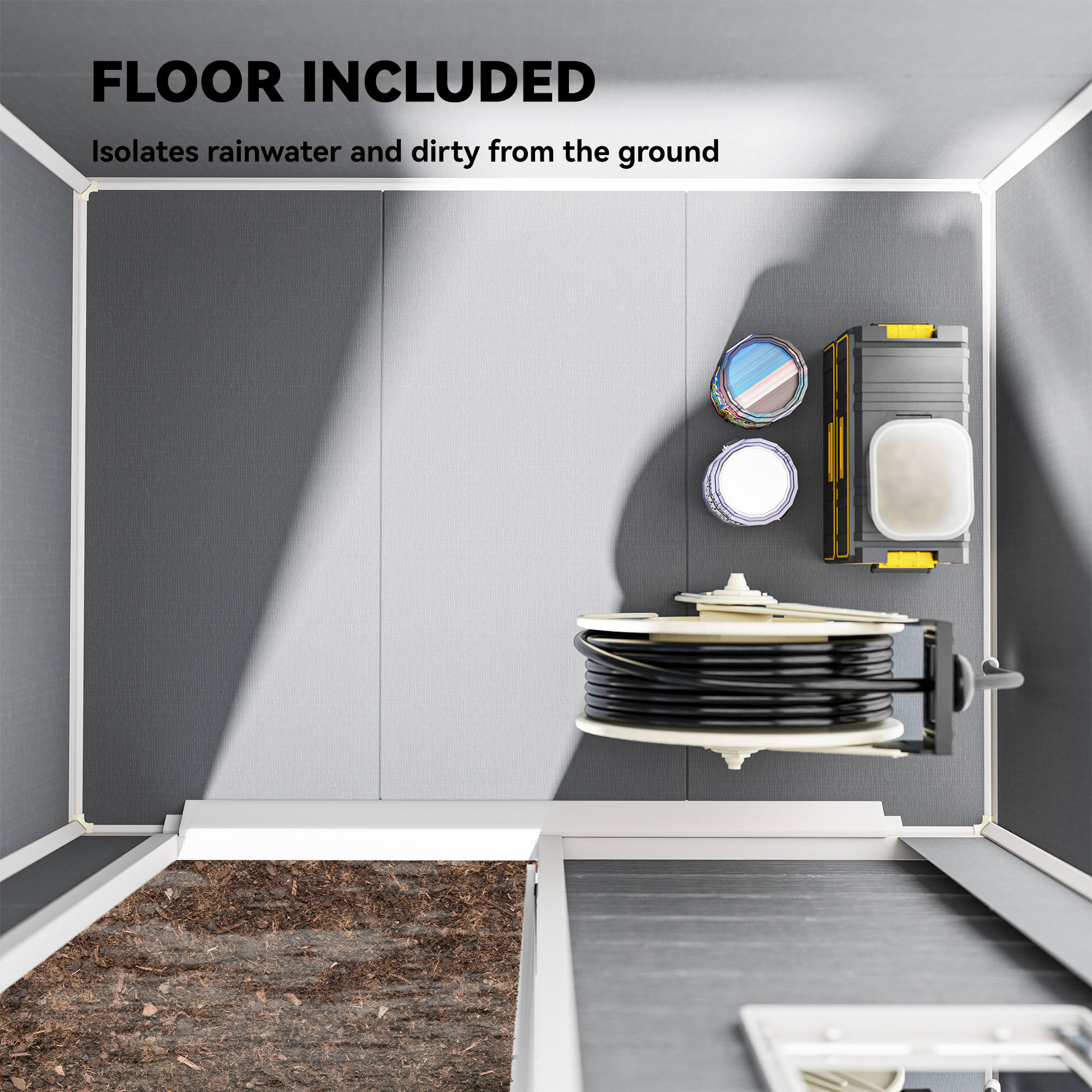 - Integrated floor prevents rainwater seepage, protecting contents