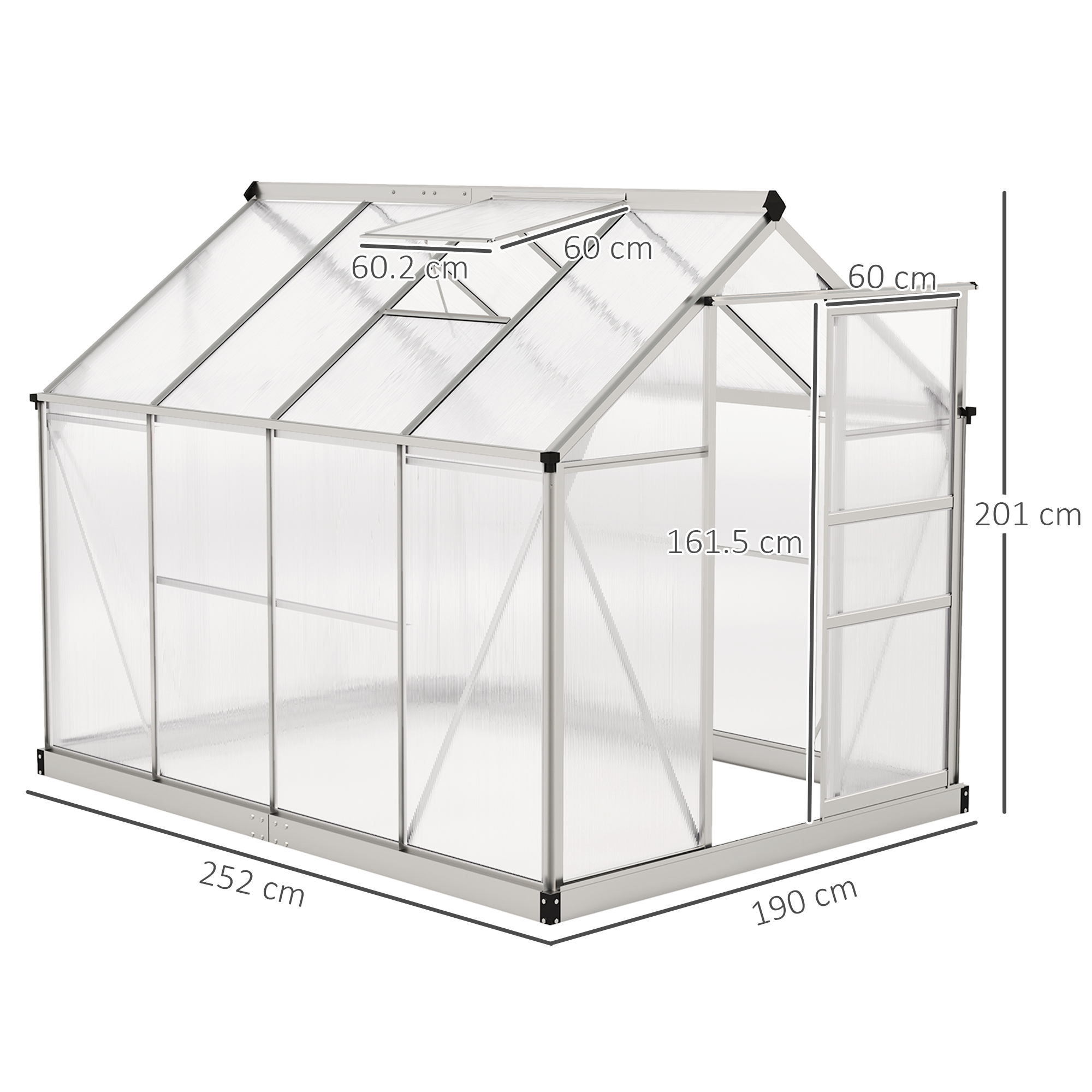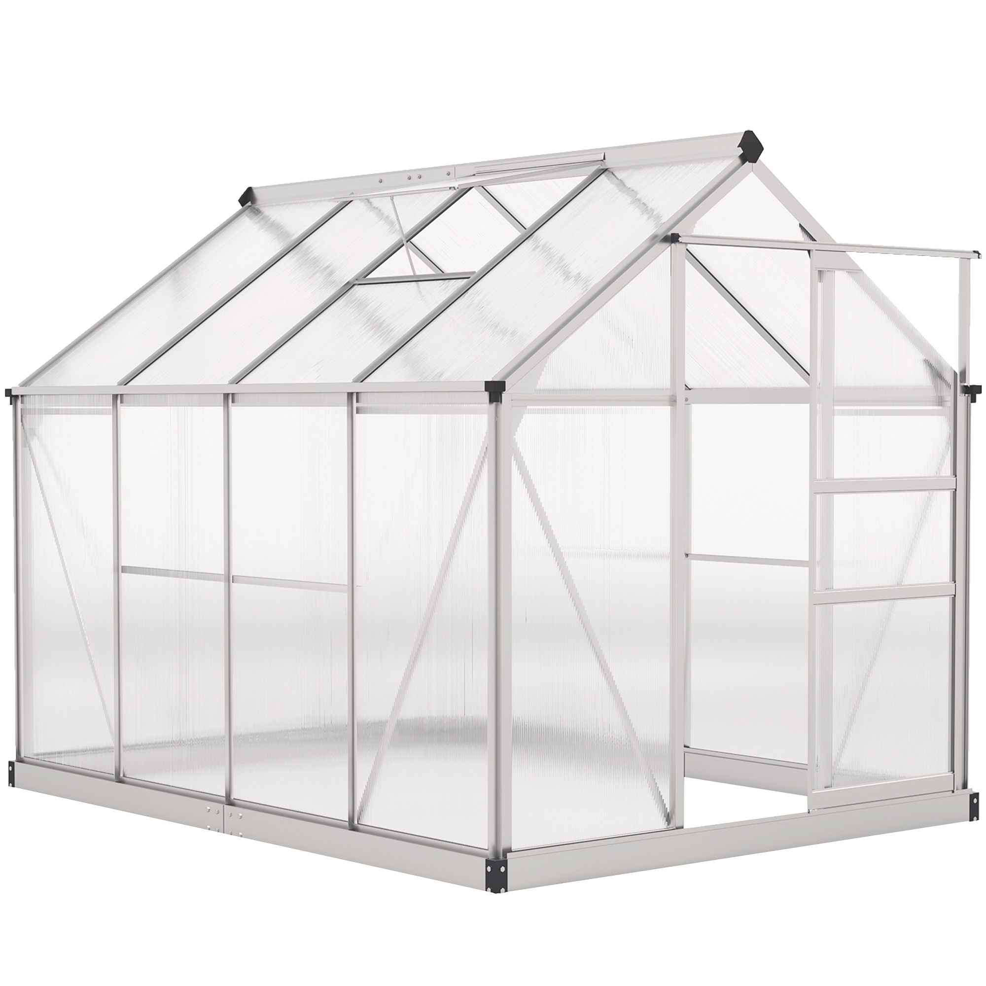 Start and continue the season right with this Outsunny 6ft x 8ft greenhouse. An open, walk-in design means it's easy to enter and leave, whilst giving you the full free space to set it up how you want. A powder-coated aluminium frame means a strong structure, with four ground stakes included to pin to the ground. Features a sliding door for easy access in and out, with a lift-up roof which holds in place - it's easy to let in fresh air, whenever you want.