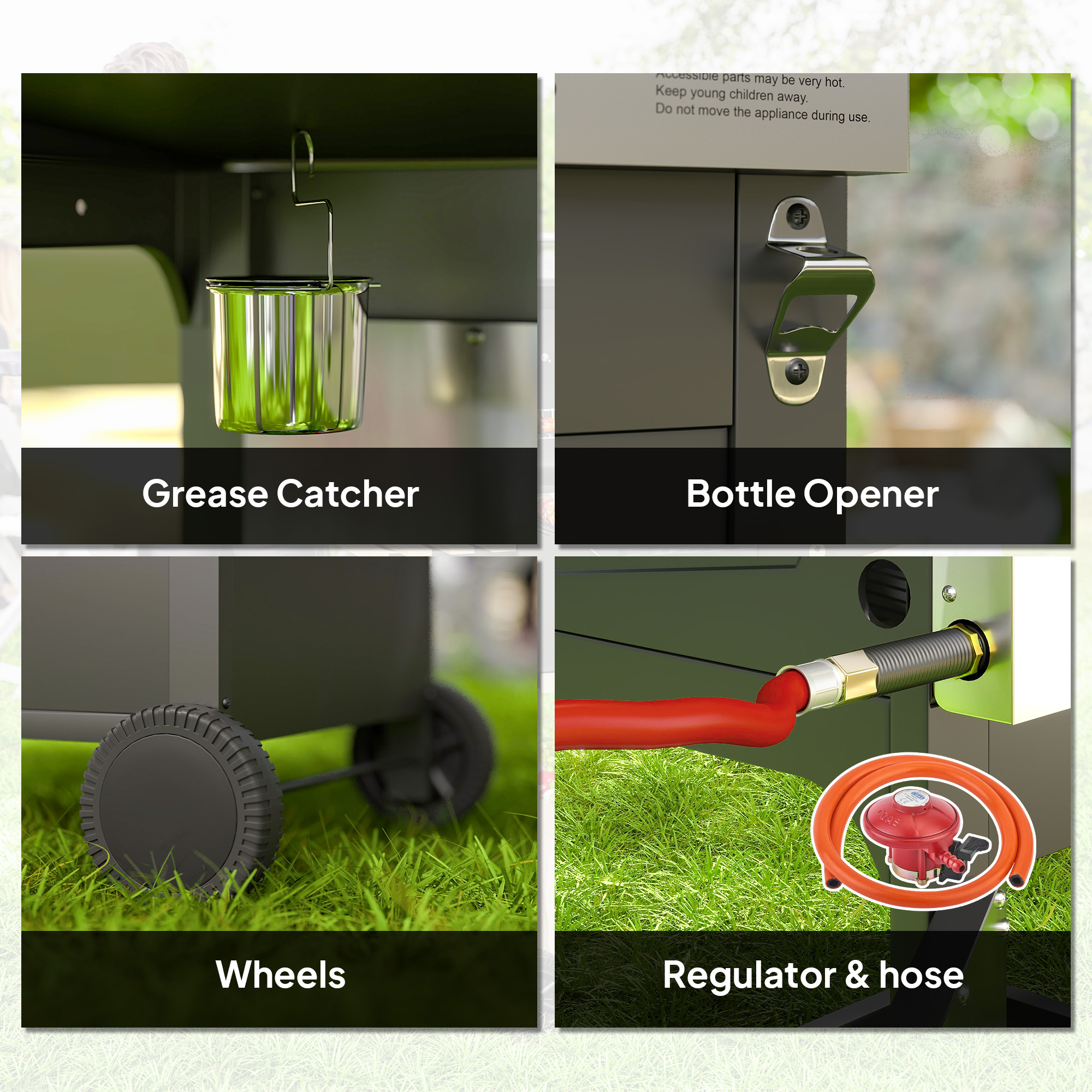 - Weight Capacity: (grill grate) 10 kg, (bottom shelf) 20 kg, (side shelf) 5 kg