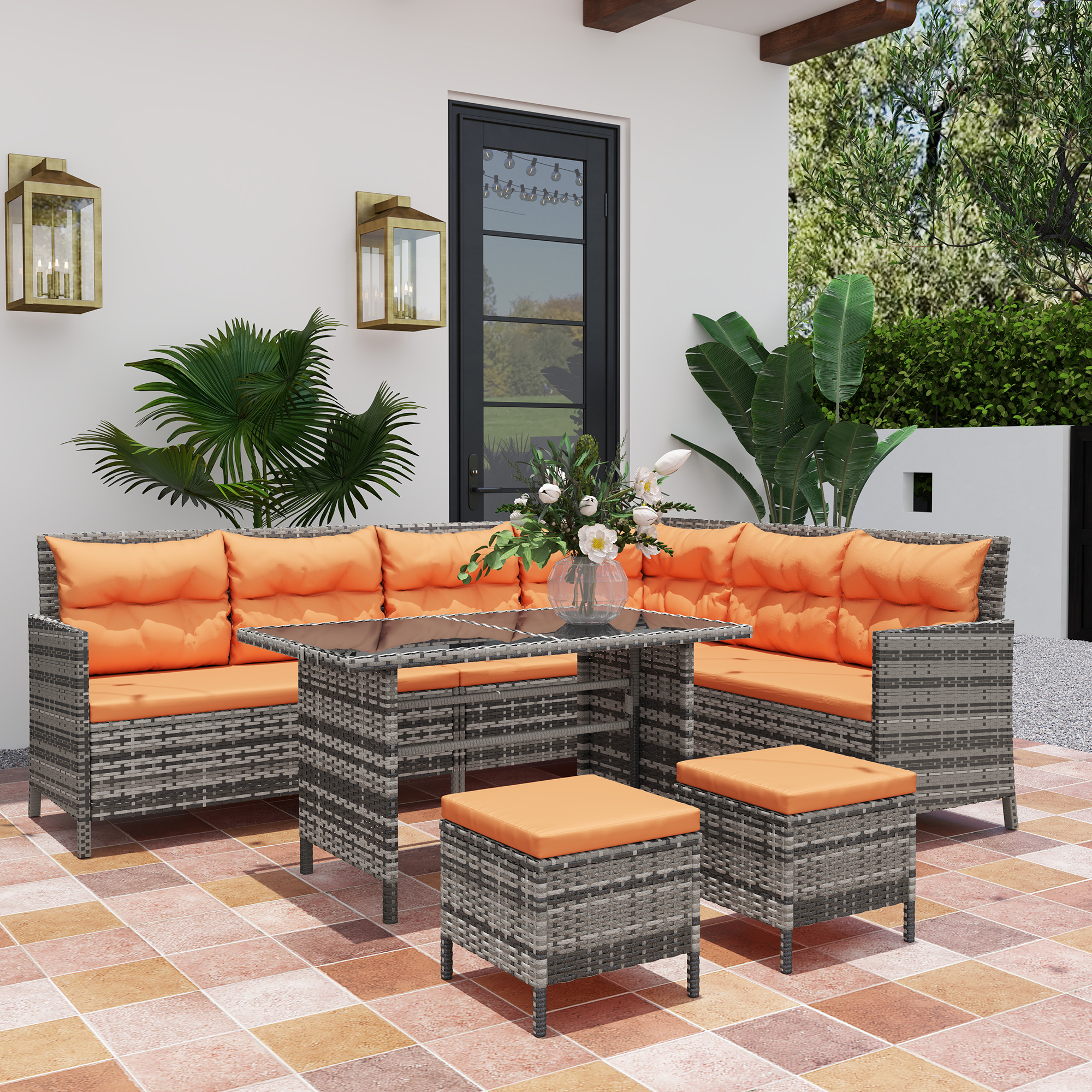 Bring some serious style into your outdoors with this outdoor corner sofa set from Outsunny. The conservatory furniture comes with two two-seater sofas, a corner chair, two footstools and a double table.The rust-resistant metal frame ensures a tough and strong core, with UV and fade resistant PE rattan wrapped around, offering double the protection and durability. The garden furniture sets are finished with sleek cream cushions all over, making this set great to have in your space too.