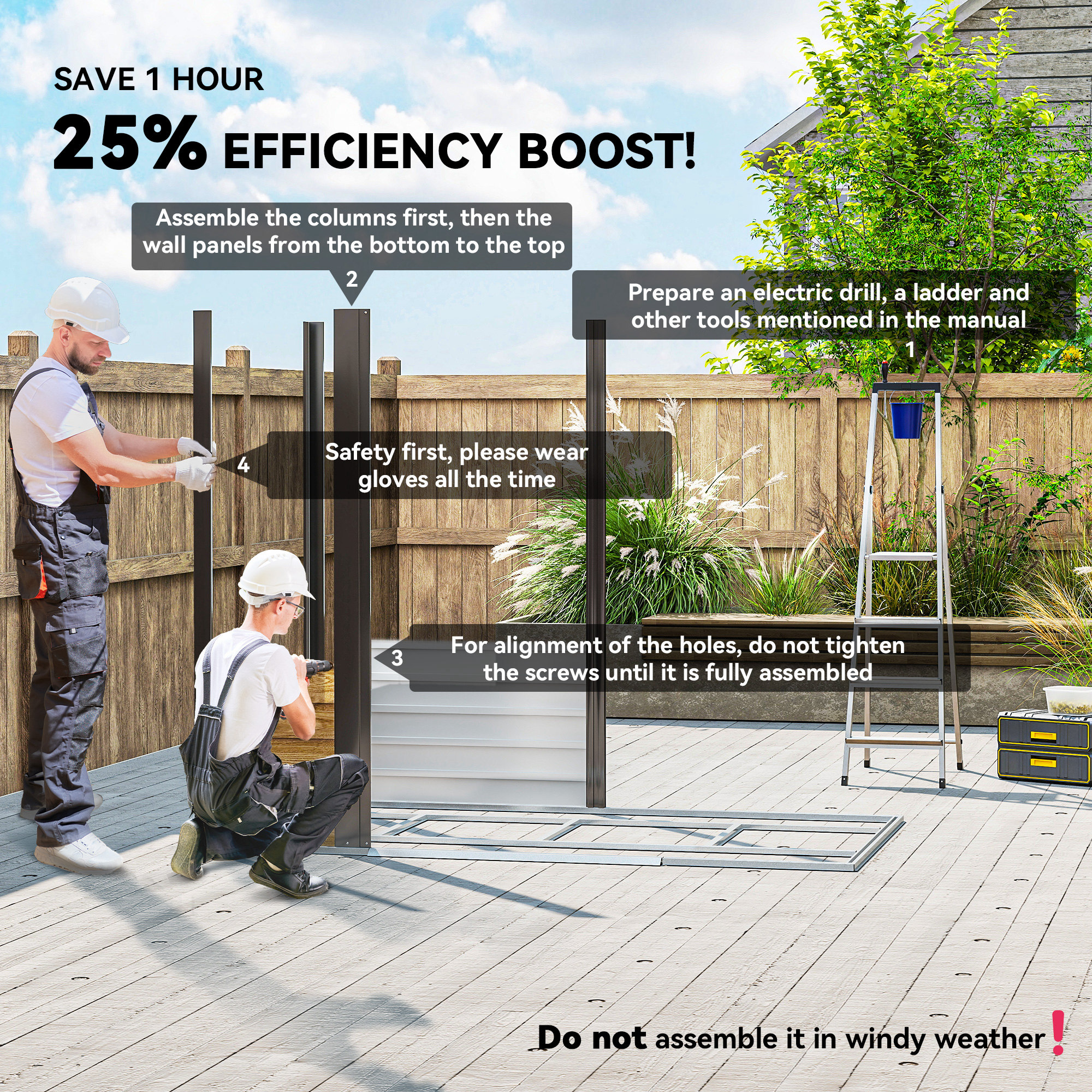 Save time for what matters – the new-style Outsunny metal shed with horizontal panels would definitely take the stress out of assembly. Tested and proven, a professional assembler can complete the setup in about 90 minutes - 30 minutes faster than assembling traditional vertical panel sheds. We anticipate that your family together will be able to complete the assembly in approximately three hours with electric drill and other tools.