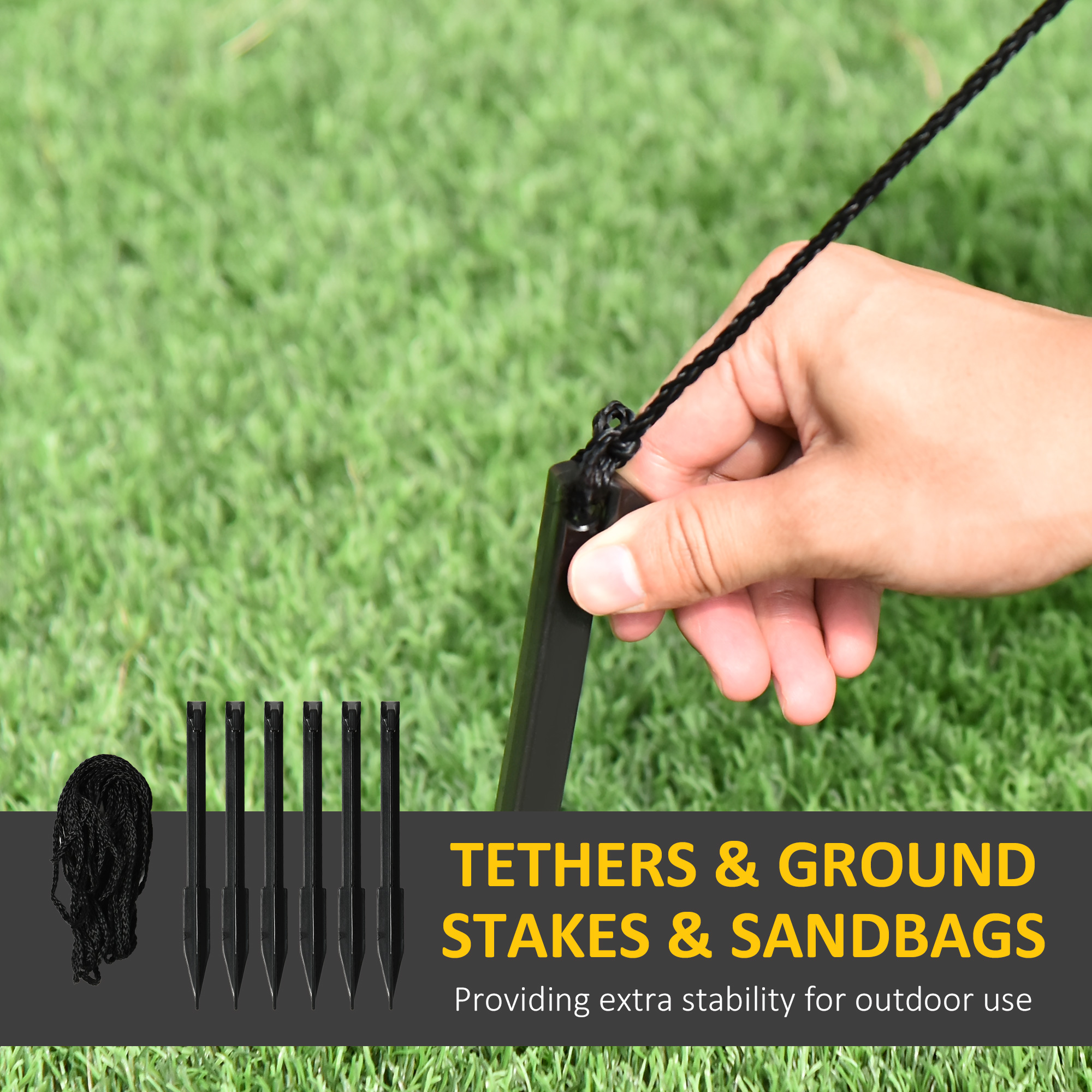 - Six ground stakes, two guy ropes and three sandbags to pin and stabilise to ground