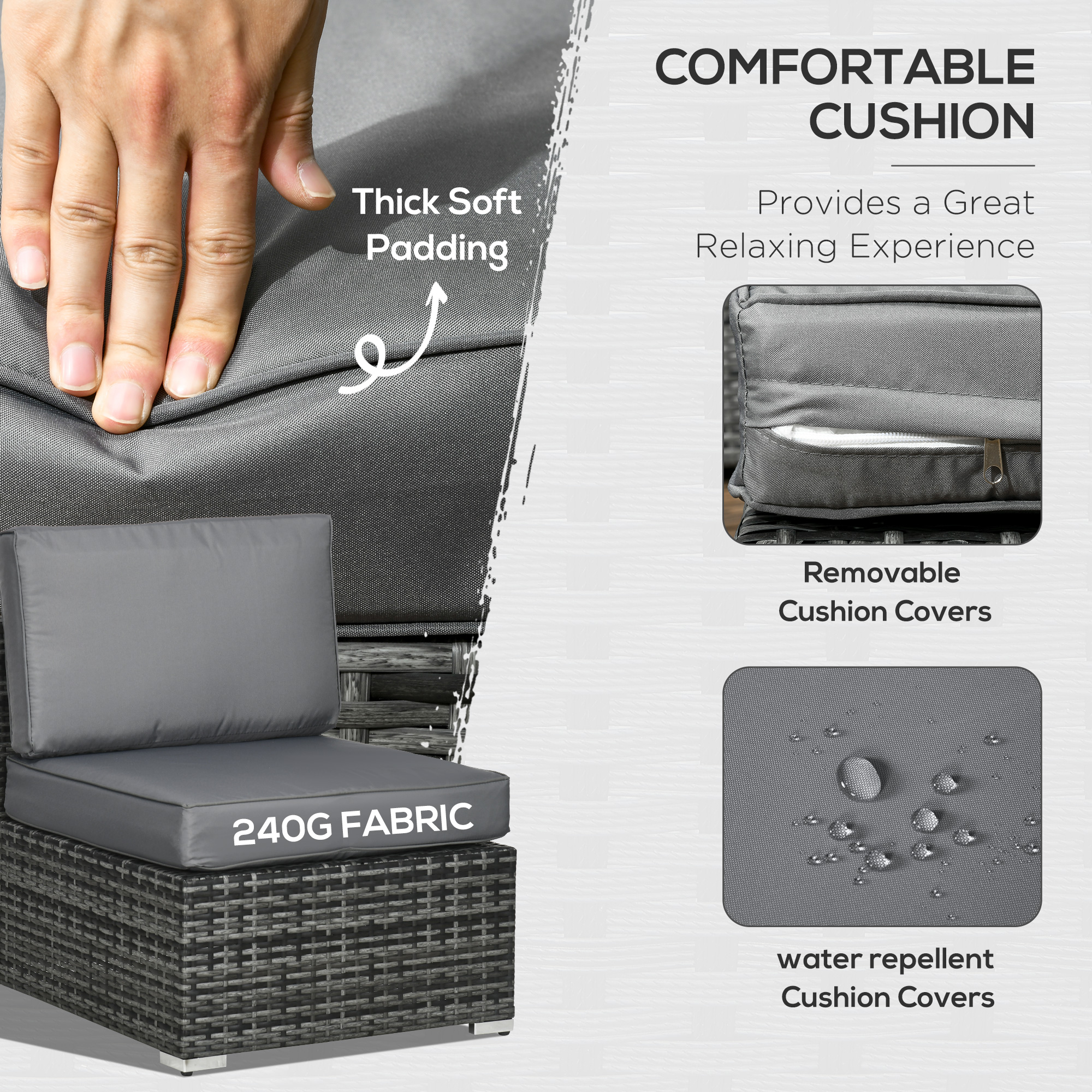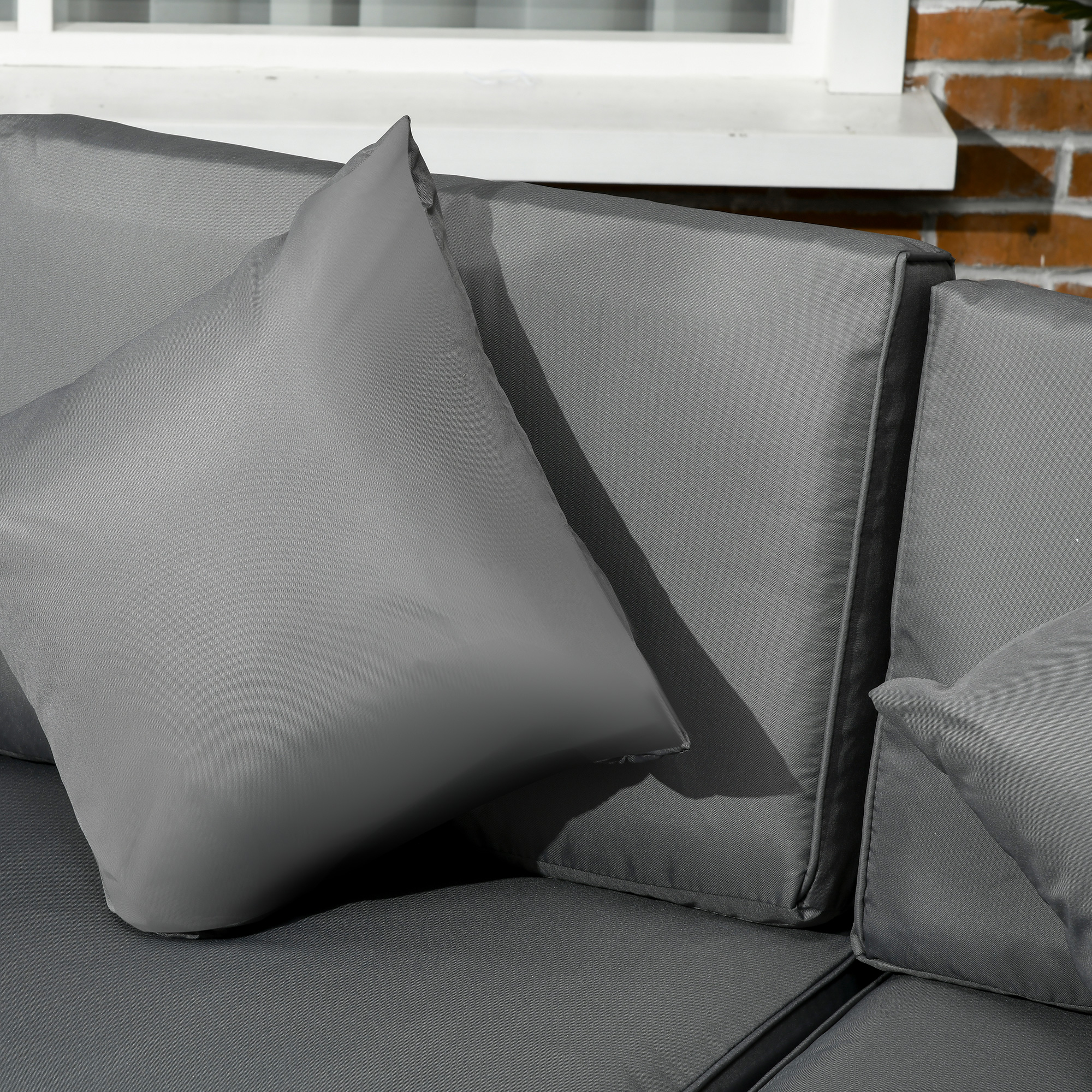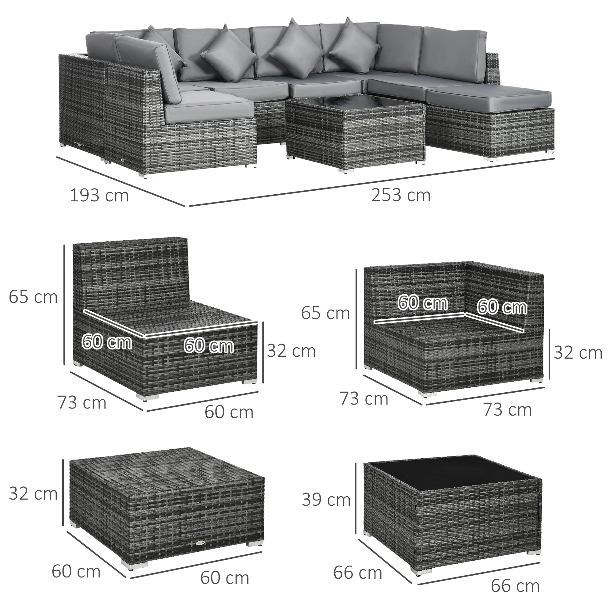 Make your garden stand out like never before. Say hello to this Outsunny garden corner sofa set. Each piece has a steel frame for strong support, wrapped in plastic wicker for double the durability; also creating a forever-stylish set for your outdoor space. Comes with two corner seats, four normal seats, a footstool and table - set up into a shape which you want. Padded cushions for comfort, with four coloured cushions for a touch of bold beauty.