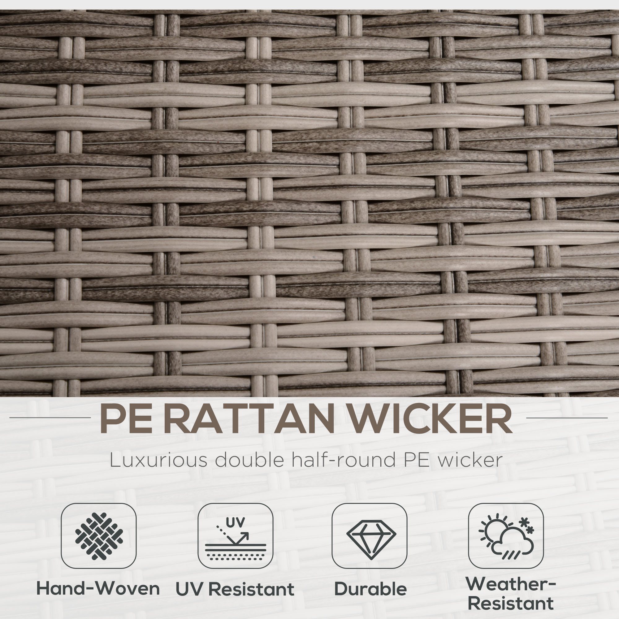 - Powder coated steel frames are strong, wrapped in UV and water-resistant plastic wicker