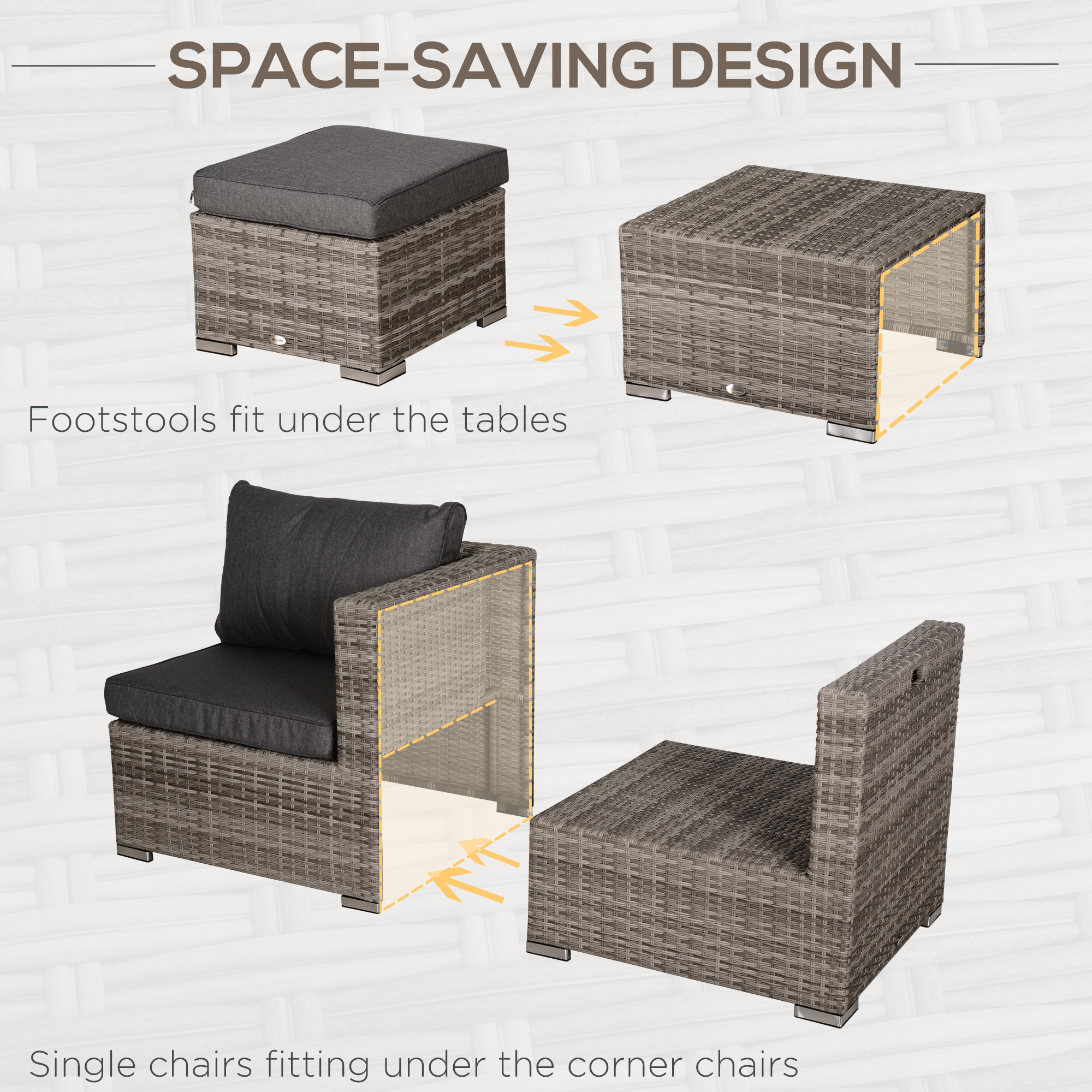Take comfort to your garden with this eight-piece outdoor furniture from Outsunny. Powder coated steel frames make each piece strong and supportive, wrapped in plastic wicker for a stylish rattan look; also creates a protective shell. Set comes with two armless chairs, two footstools and two square tables - seats up to six people. Compact design: footstools fit under the tables and armless chairs fit into the corner chairs.