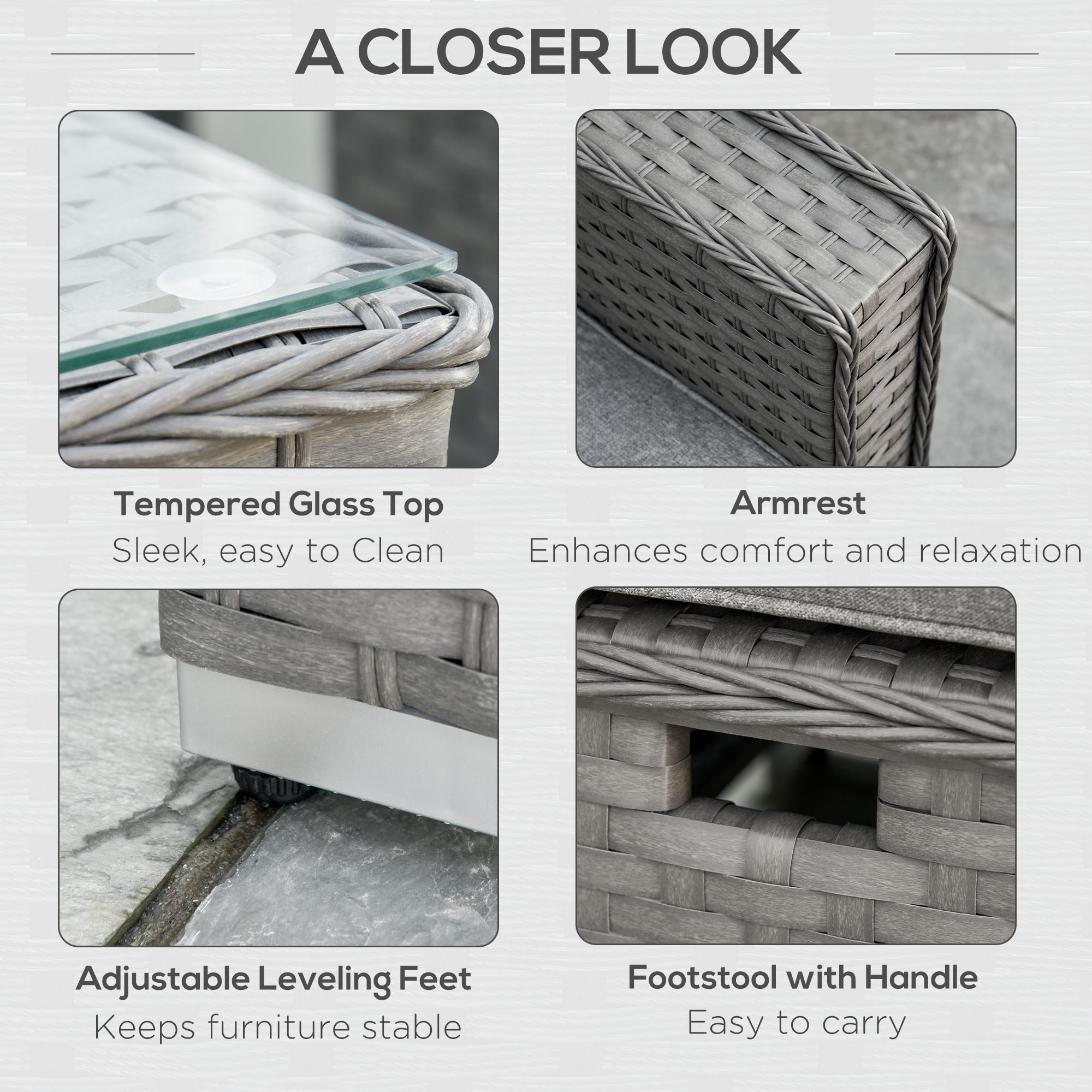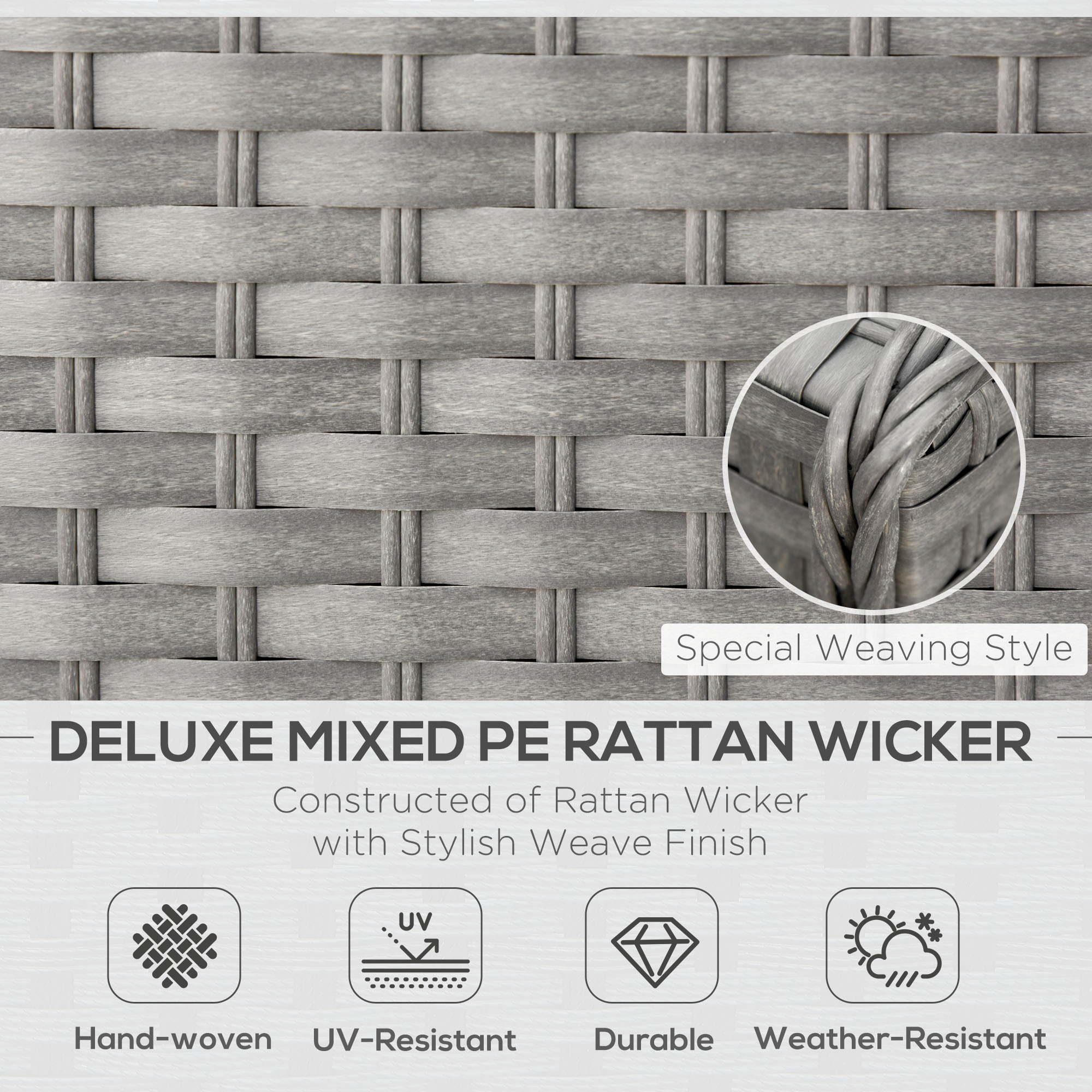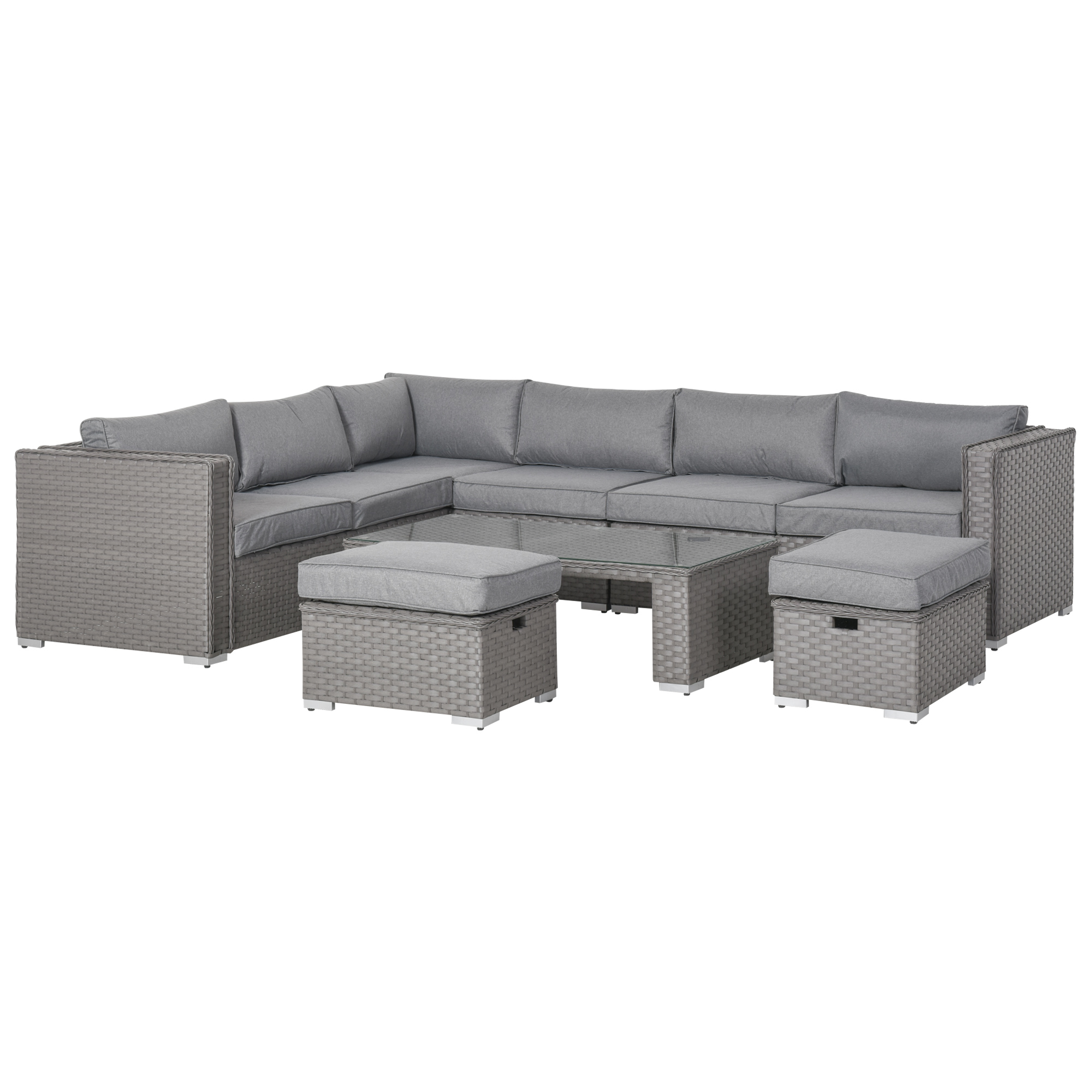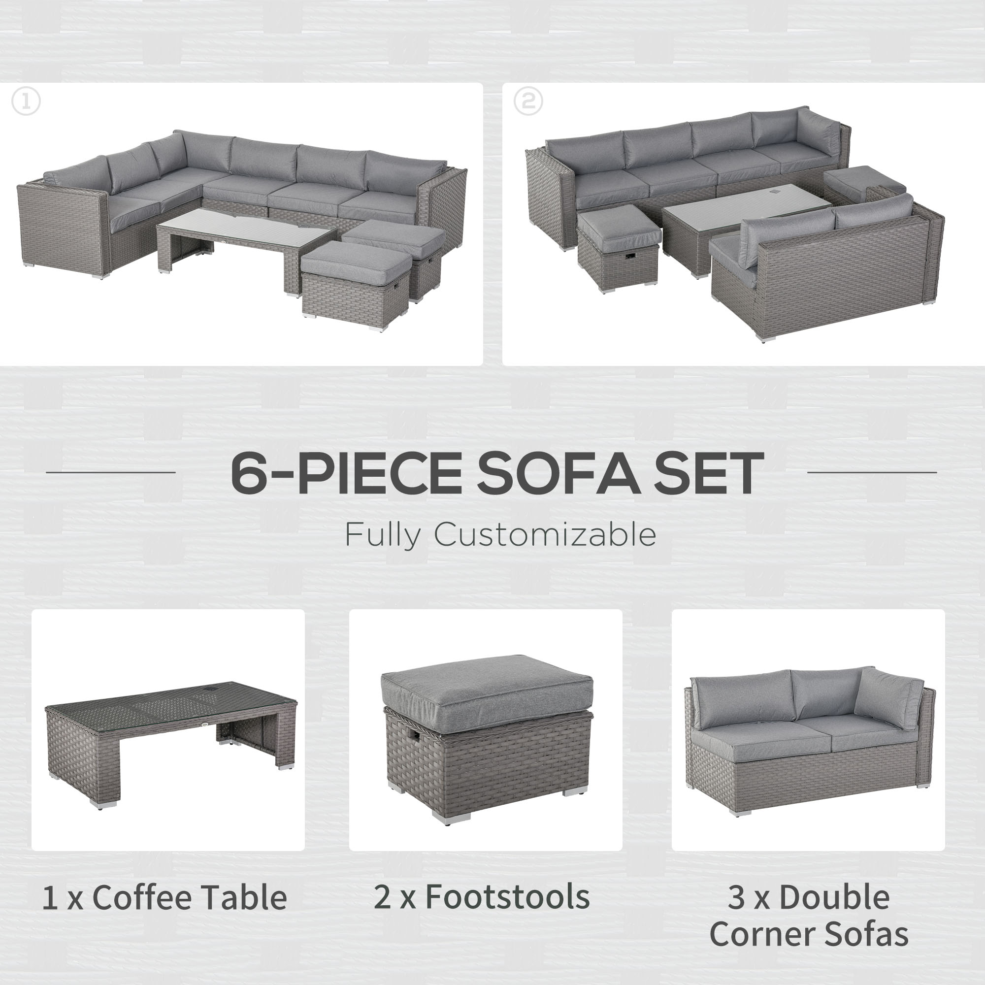 Bring comfort to your outdoor times with this Outsunny garden rattan furniture sets. Formed of three double corner sofas, a long coffee table and two footstools. Aluminium makes the frame of the rattan garden furniture for a strong structure, wrapped in UV and fade resistant PE rattan, so each piece of the conservatory furniture is durable and suitable for outdoor use. Each piece of the garden furniture sets finished with cushion s for comfort.