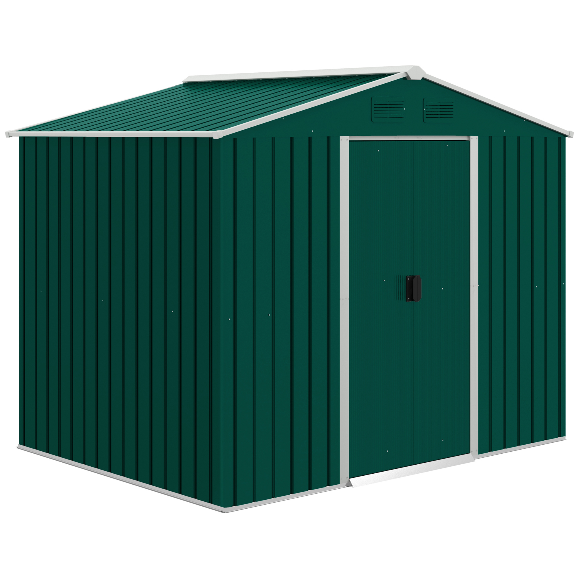 This Outsunny tool shed is the top place to keep your tools, garden equipment and outerwear stored and protected. It's made from galvanised steel - a tough and durable shell, resistant to mild weather and rusting. The sloping roof helps prevent rain water from accumulating, so it doesn't seep through and damage inner items. Metal garden shed is complete with a double sliding door for easy access, plus four ventilation slots to keep inside aerated and fresh.