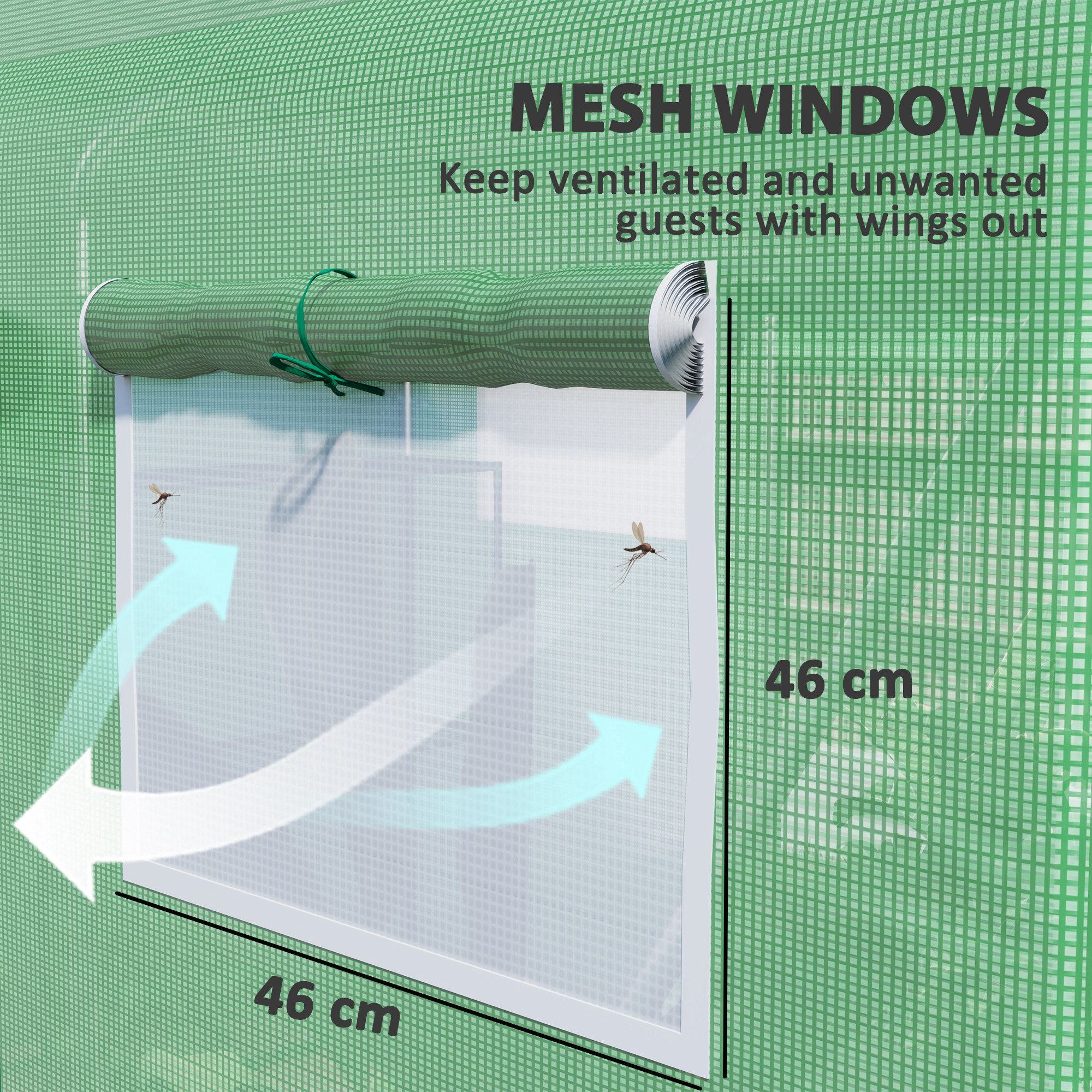 - Three roll-up doors for easy access, with six mesh windows for air