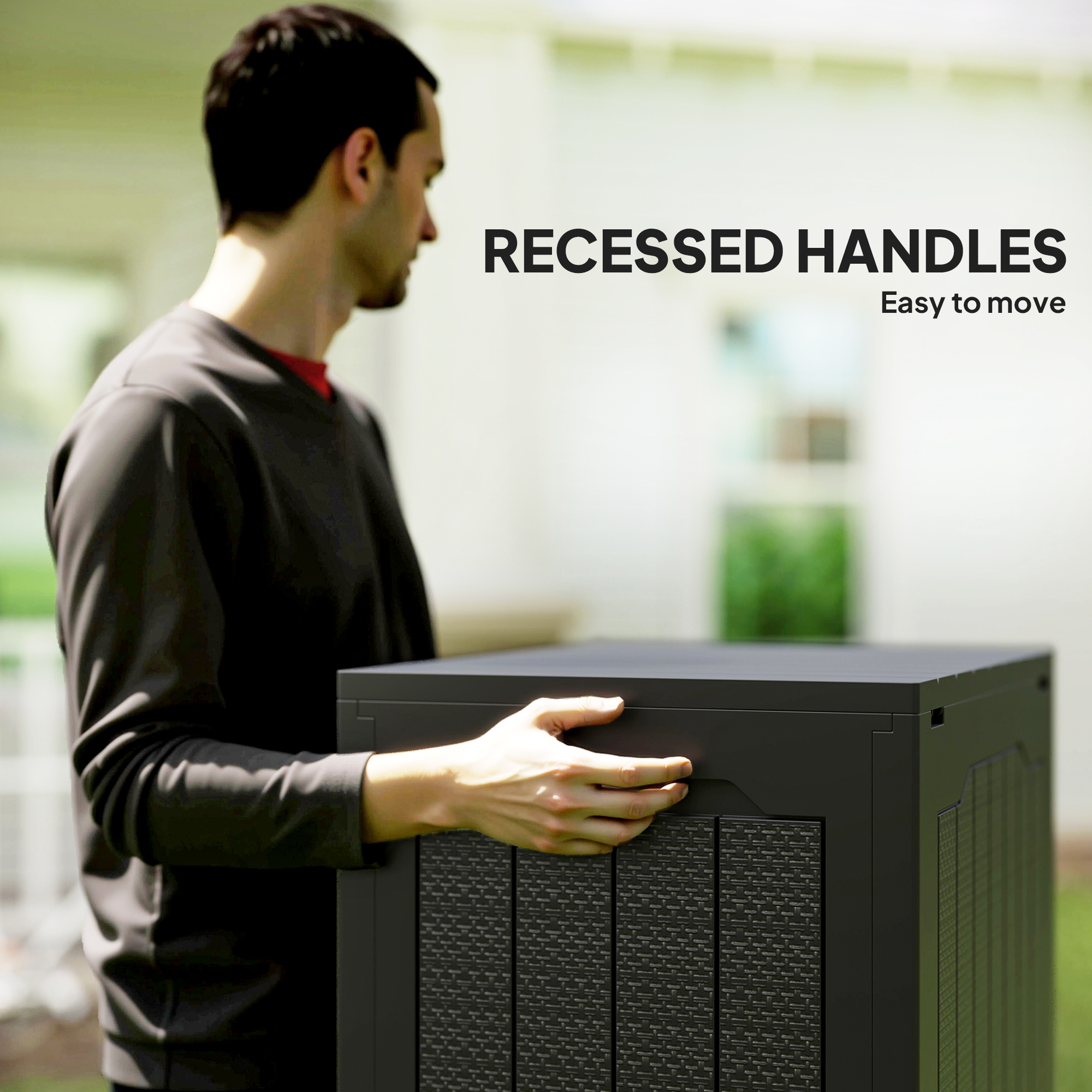 - Two recessed handles allow for easy movement of the box
