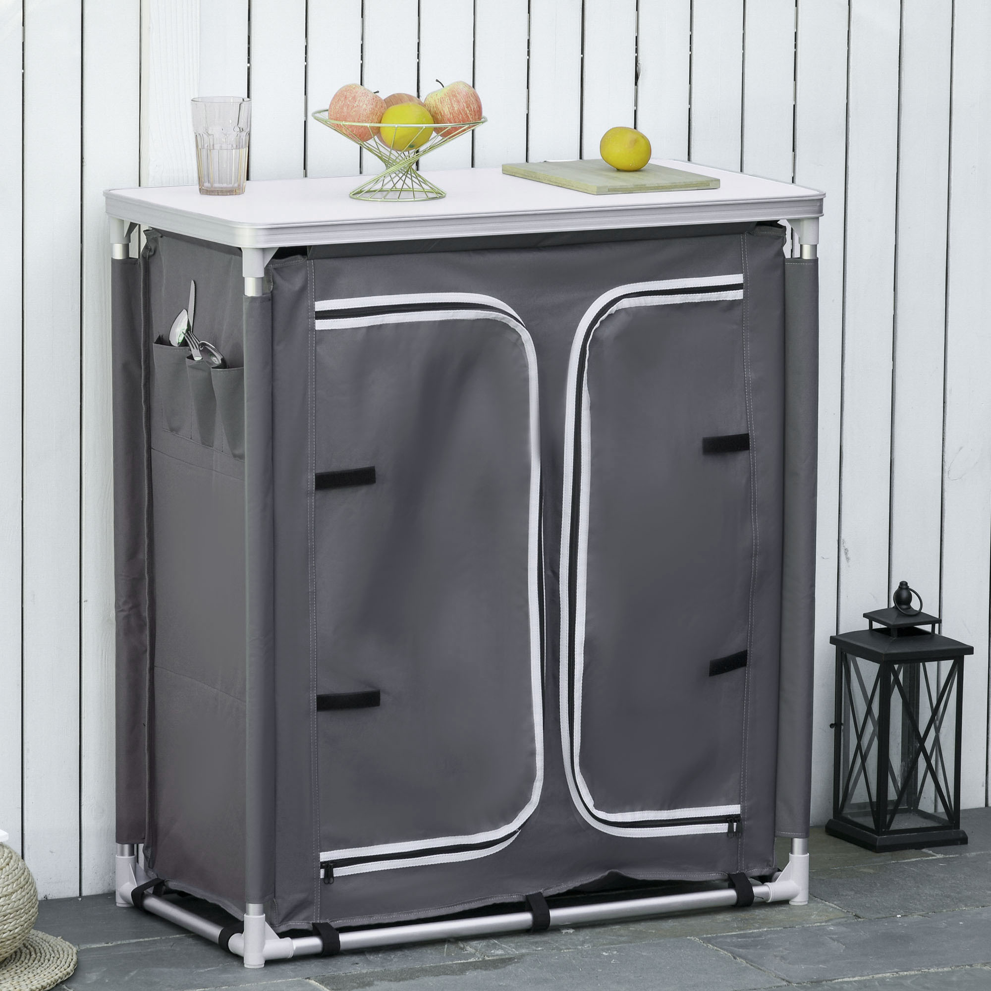 Ready when you are, this camping cooking table from Outsunny is a must for your camping trips, outdoor gatherings, and more. Made from aluminium, the outdoor kitchen unit's frame is lightweight and tough for reliable repeated use. The fabric coat covering the frame is water-resistant and features a door to shield inside. Three shelves on the left are great for organising, the right side area offers storage for larger items. Comes complete with the bag for easy carrying.