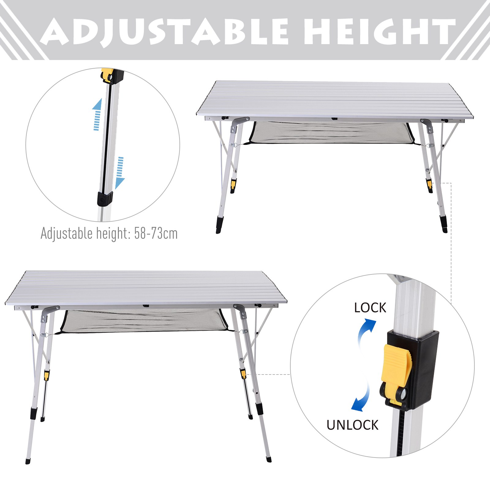 Bring simplicity into dining during your outdoor adventures with this picnic table from Outsunny. Formed from aluminium to ensure it is lightweight yet sturdy, this table is formed of two parts: the base and the tabletop. Foldable in design, the base is fitted with four legs, all of which can be adjusted from 58cm to 73cm, with rubber pads on the legs to keep it balanced on the ground. This piece completed with a fabric mesh sling for keeping plates, cutlery and condiments close to you.