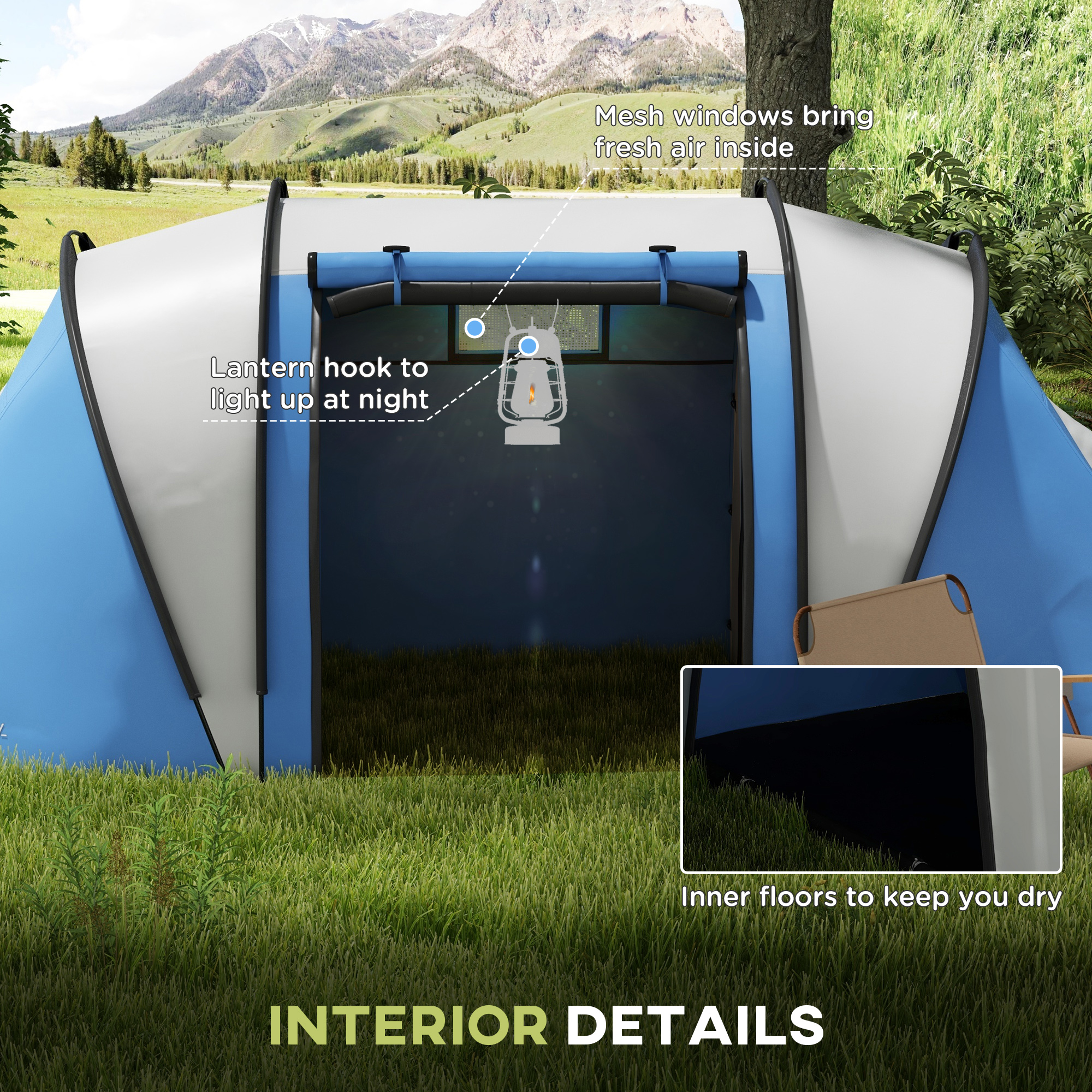 Camping memories, shared, with this Outsunny two-man tent. The three-room design gives you both your own bedroom with plenty of space, with the middle section to give you place to chill. The fabric shell is water-resistant up to 3000mm - great for mild to heavier weather conditions in spring and summer. With zipped doors for easy access and three mesh windows to bring fresh air inside, set comes with 16x ground stakes, 18x guy ropes, 2x support poles and carry bag.