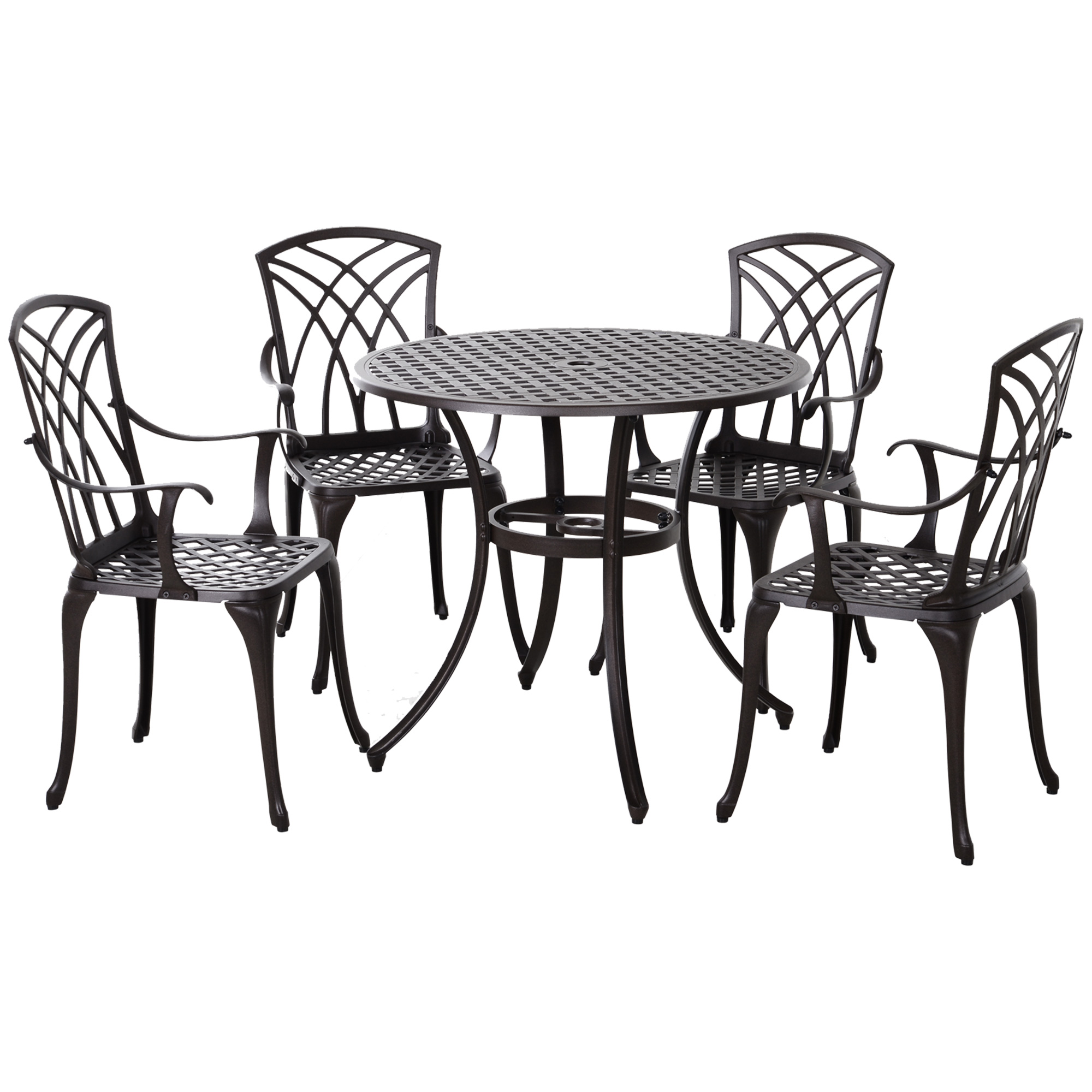This five-piece outdoor garden furniture set from Outsunny will give you the optimal spot to dine and relax. It's formed of four chairs and a matching table, with cast aluminium forming the frame of all pieces to ensure they are robust and tough. Round in shape, the table features a middle hole to keep a sun parasol securely in place, with the back of the chairs showcasing a cut-out design for an attractive finish. Our outdoor table and chairs are great for flats and apartments with balconies.